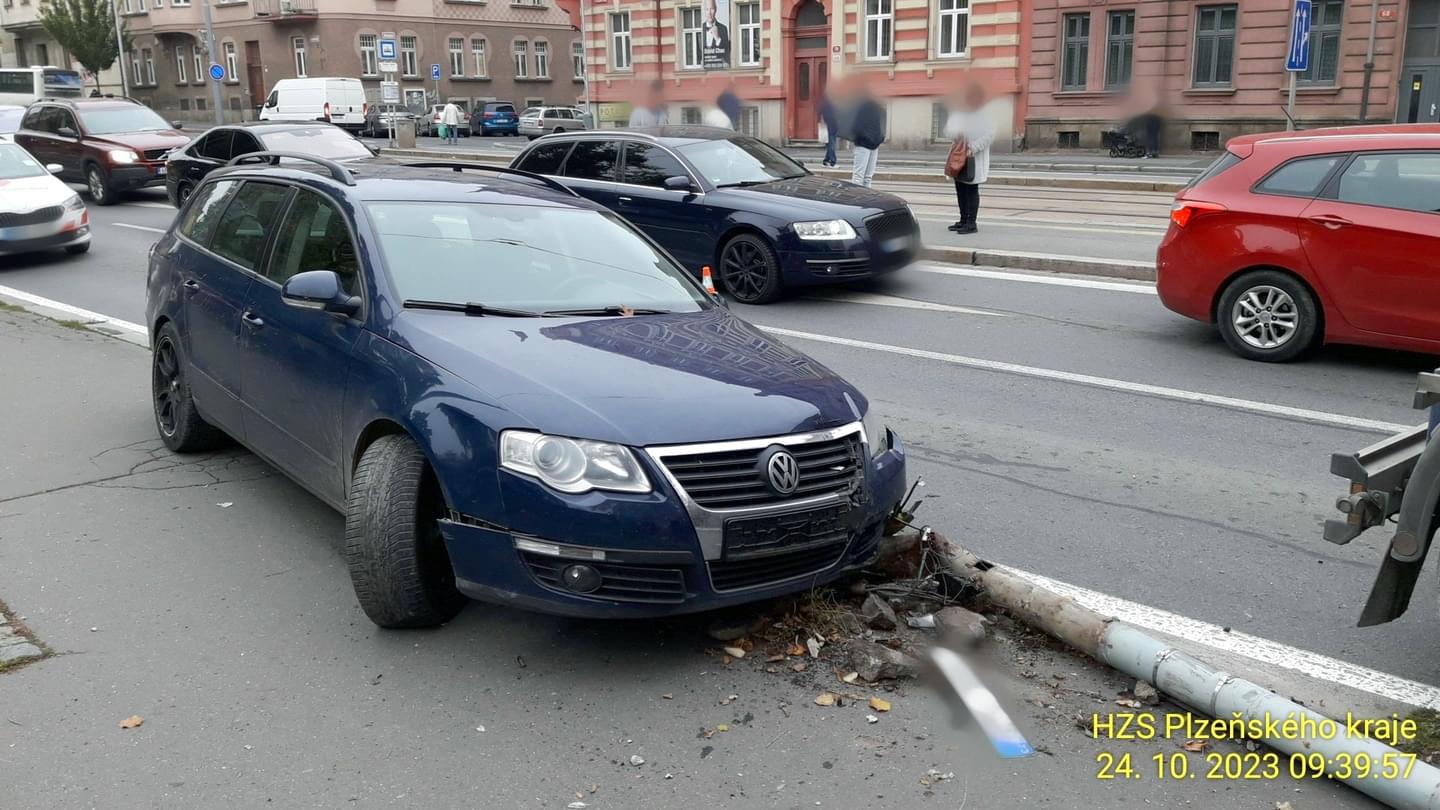"Nákladní automobil řízený mužem narozeným v roce 1967 jel po Klatovské třídě v levém jízdním pruhu ve směru do centra města. Při přejíždění do pravého jízdního pruhu zřejmě řidič přehlédl osobní automobil VW řízený mužem narozeným v roce 1978 a došlo ke střetu.Obě vozidla přitom najela na chodník, kde se kamion střetl zpětným zrcátkem se sloupem veřejného osvětlení a do tohoto sloupu poté narazilo i osobní vozidlo, které ho porazilo.