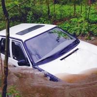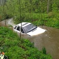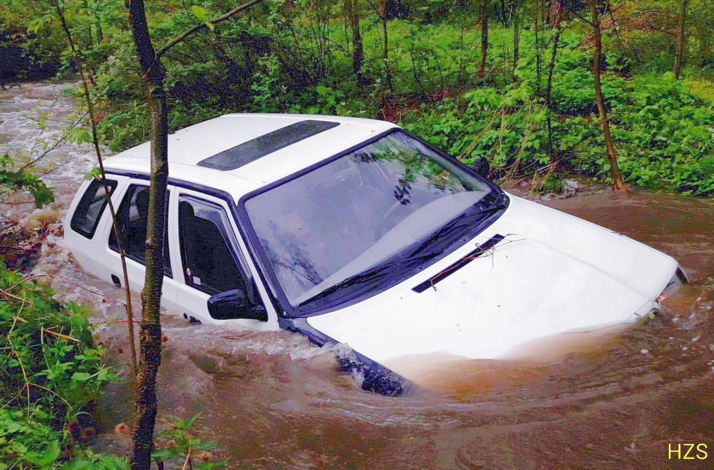 Rozvodněný Radnický potok ale vozidlo doslova spláchl a proud ho odnesl