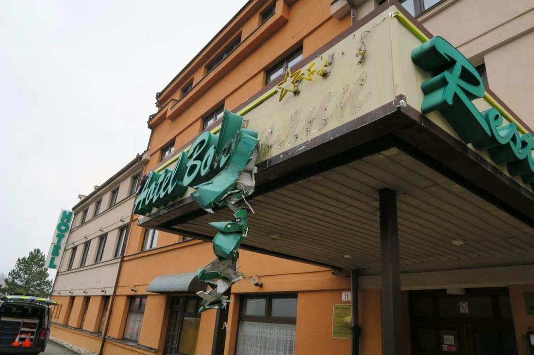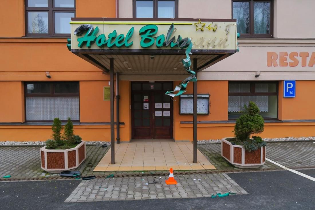 "Jednatřicetiletý řidič nákladního vozidla Mercedes Benz s návěsem Schmitz jedoucí ve směru z obce Folmava na Domažlice návěsem poškodil neonový nápis na budově hotelu a plechové opláštění střechy vestibulu," popsala tisková mluvčí policie s tím, že dále došlo k poškození pravého vnějšího zpětného zrcátka na jeho nákladním vozidle. "Řidič po střetu vystoupil z vozu, podíval se, zda došlo k poškození, nic však prý neviděl. Věc neoznámil na policii, nesepsal společný Záznam o dopravní nehodě a z místa dopravní nehody odjel," pokračovala mluvčí.