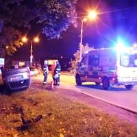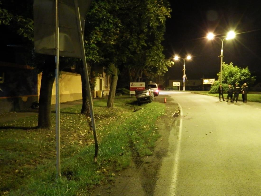 Vůz jedoucí ve směru od centra v pravotočivé zatáčce vyjel ze silnice, narazil do značky a stromu, o který utrhl kolo a skončil v příkopu na střeše.