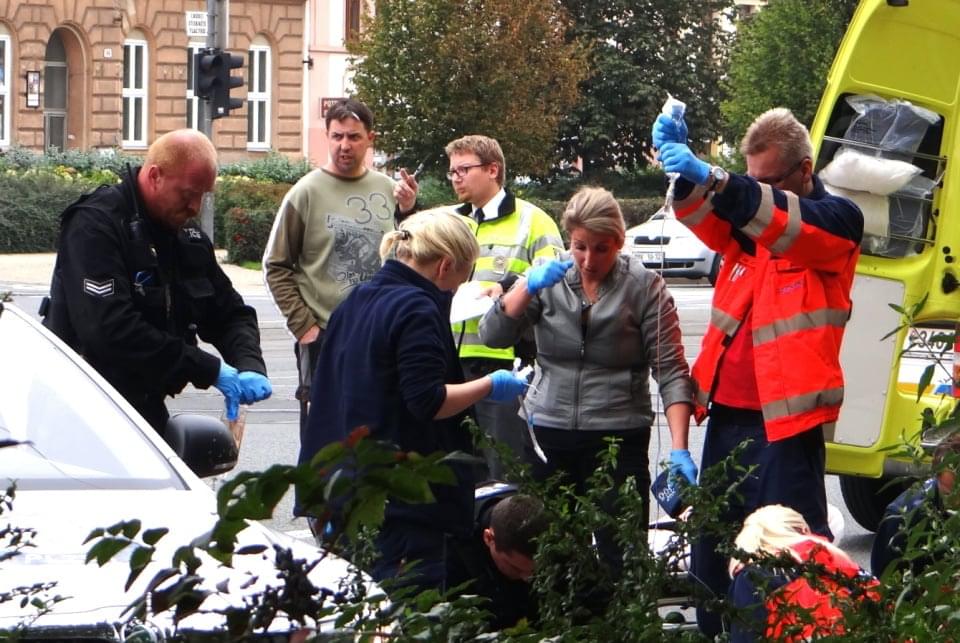 První na místo dorazili strážníci městské policie, kteří jeli kolem. Naštěstí pro ženu šlo o výjezdovou skupinu z oddělení Bory, o kterých jsme již několikrát psali. Jde o skupinu, která má mimo jiné i profesionální záchranářský výcvik a hlavně, jejich vozidlo má ve výbavě nadstandardní zdravotnickou výbavu. Strážníci vozidlem zablokovali jízdní pruhy, aby tak vytvořili bezpečný prostor pro záchranné práce a okamžitě zahájili první pomoc. Zastavili krvácení a ženu resuscitovali až do příjezdu ZZS. Dalším, kdo přispěchal na místo, byla záchranářka z Plzně - Jihu, která šla náhodou kolem, ta si okamžitě nasadila rukavice a připojila se k posádce Zdravotní záchranné služby, v boji o život sražené ženy.