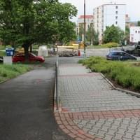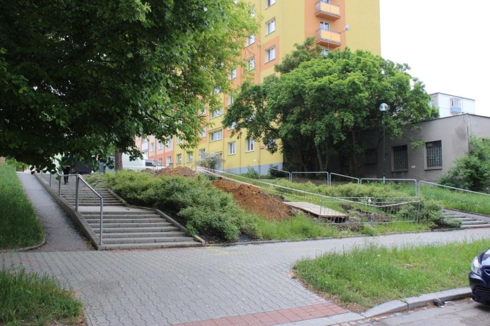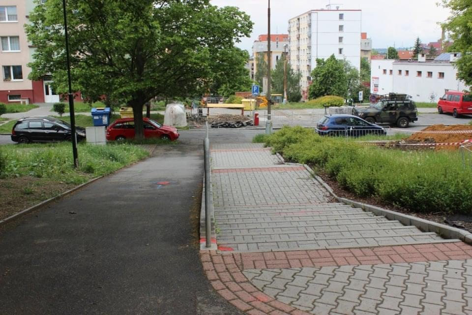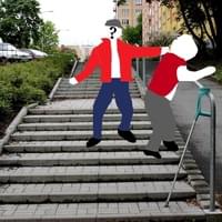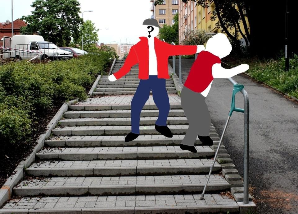 Babička se vrací Partyzánskou ulicí, která ústí schodištěm do ulice Sousedská. Právě na tomto schodišti vybíhá proti babičce mladý muž, ve věku možná kolem dvacetiti let, má štíhlou postavu střední výšky, je bílé pleti, s hnědými vlasy, skrytými pod baseballovou čepicí. Má tmavé kalhoty a výraznou, červenou bundu.