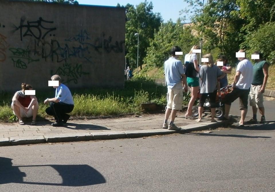 Poté se snažila ještě něco vyndat ztašky na kočárku a přitom ho převrhla, naštěstí zněj na poslední chvíli stačil strážník vyndat asi rok staré dítě.