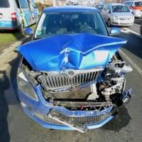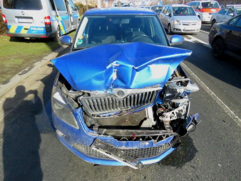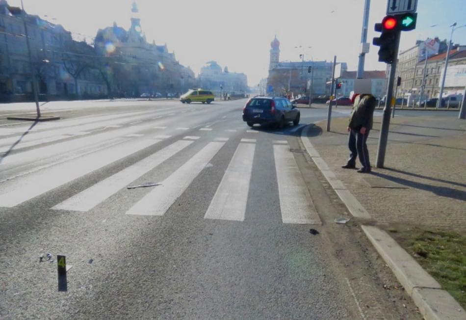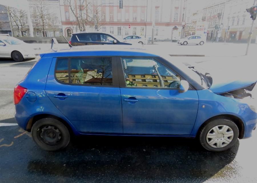 V sobotu před devátou hodinou ráno jel řidič vozidla Škoda Fabia po Sadech Pětatřicátníků ve směru do centra, když na křižovatce Solní a Palackého náměstí narazil do na semaforu stojícího Fordu Mondeo, o jehož vlečné zařízení si zničil celý předek.