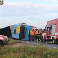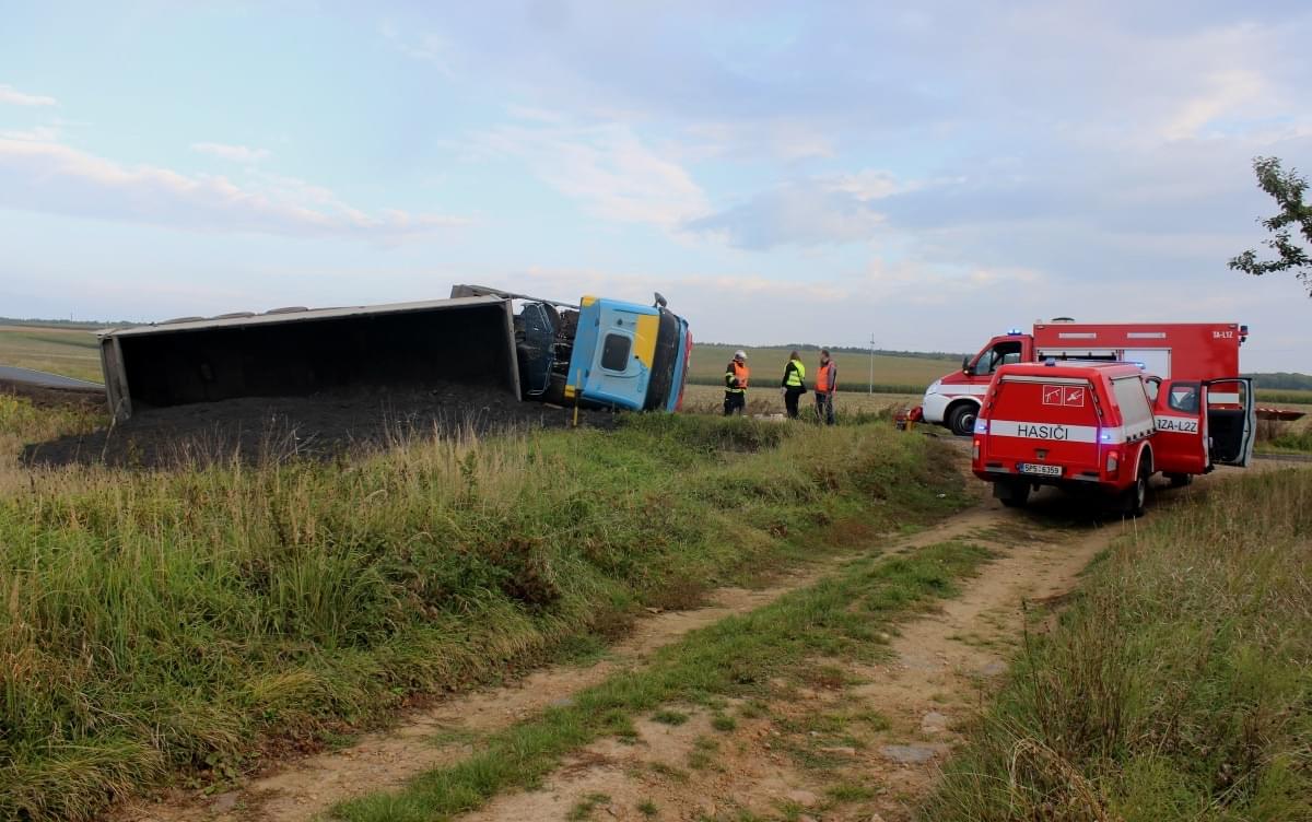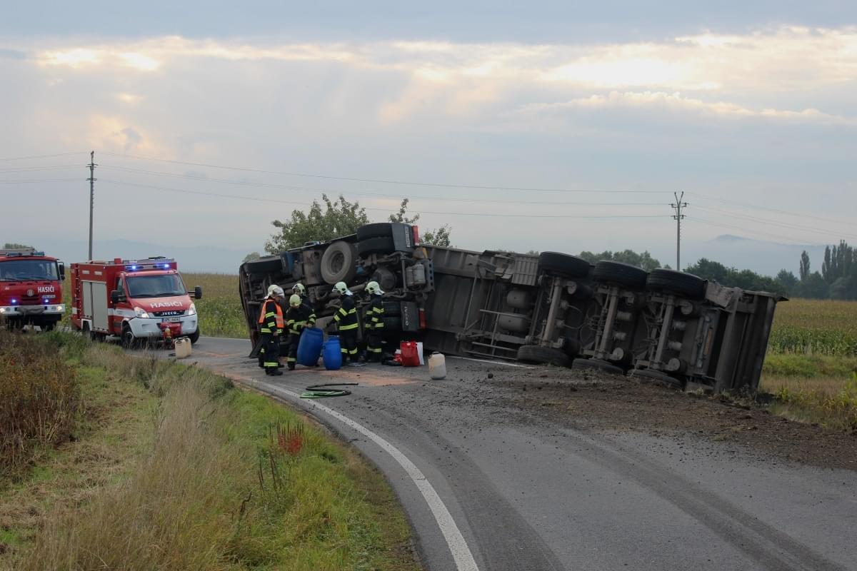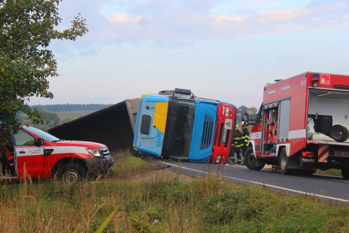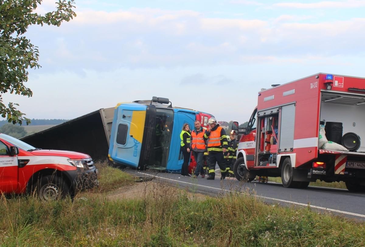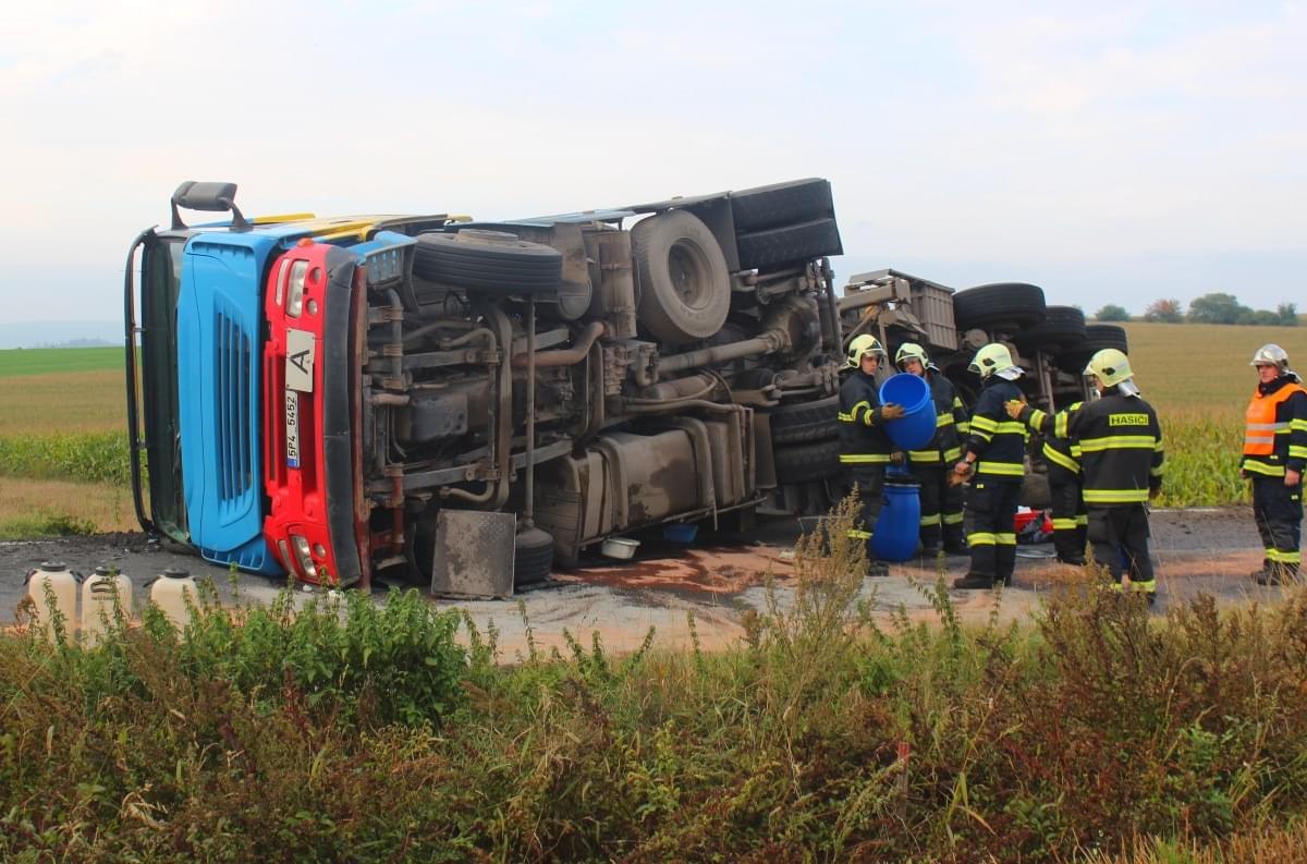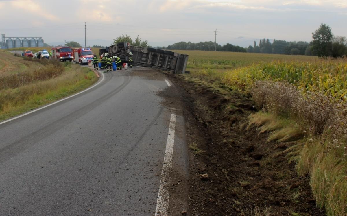 Z vozidla vytekla nafta, která znečistila pole, na místě nyní zasahují hasiči a silnice je neprůjezdná.