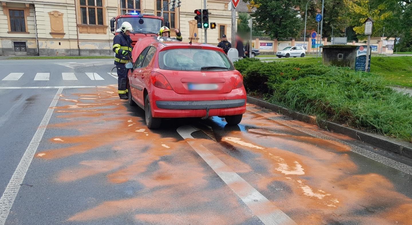 Z vozidla ale unikal olej, který vytvořil skvrnu v délce přibližně 100 metrů, tu museli hasiči zlikvidovat pomocí sorbentu.