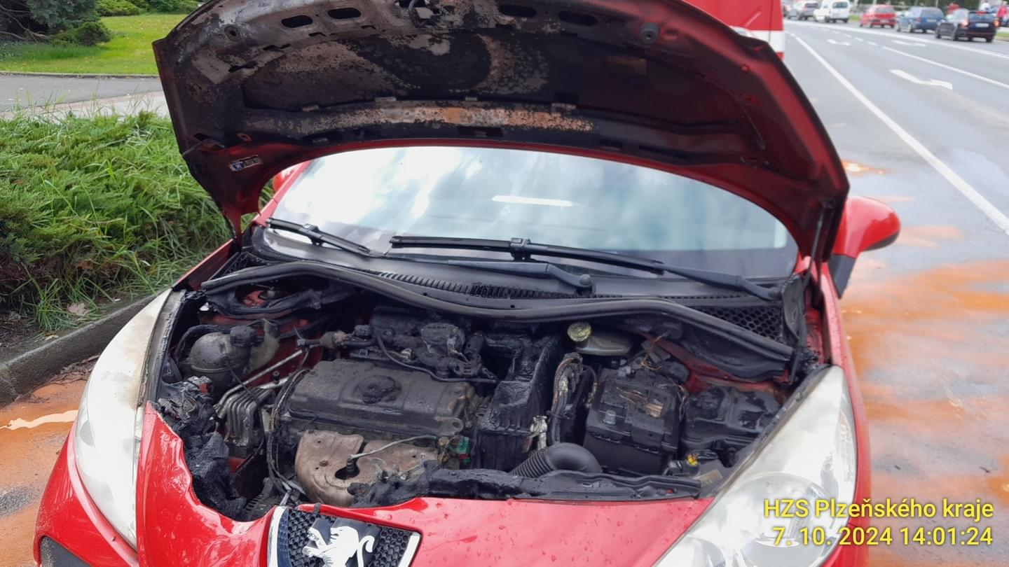 Když stál vůz na křižovatce, začal hořet v motorové části.