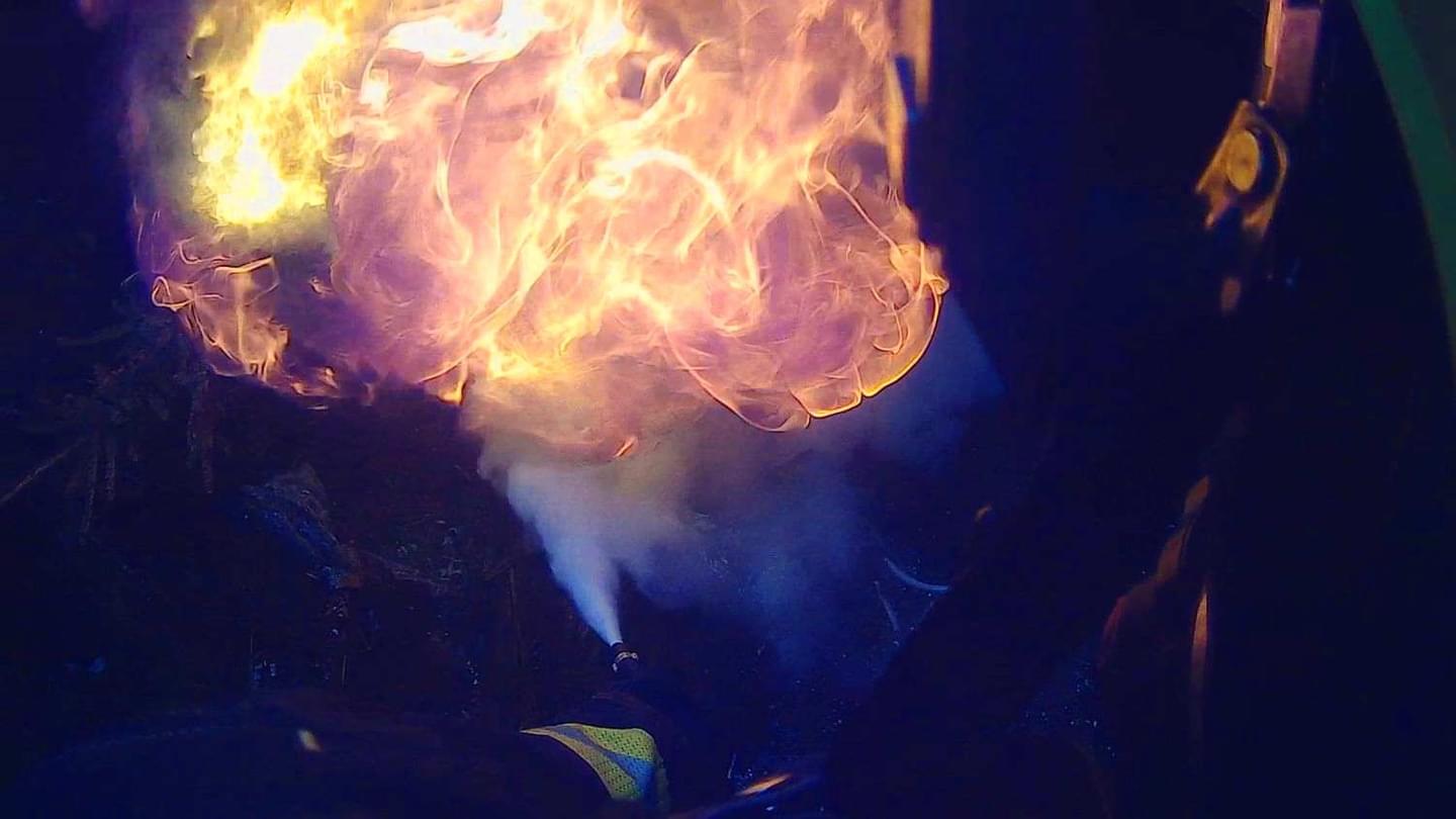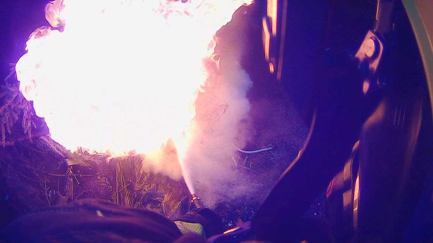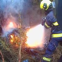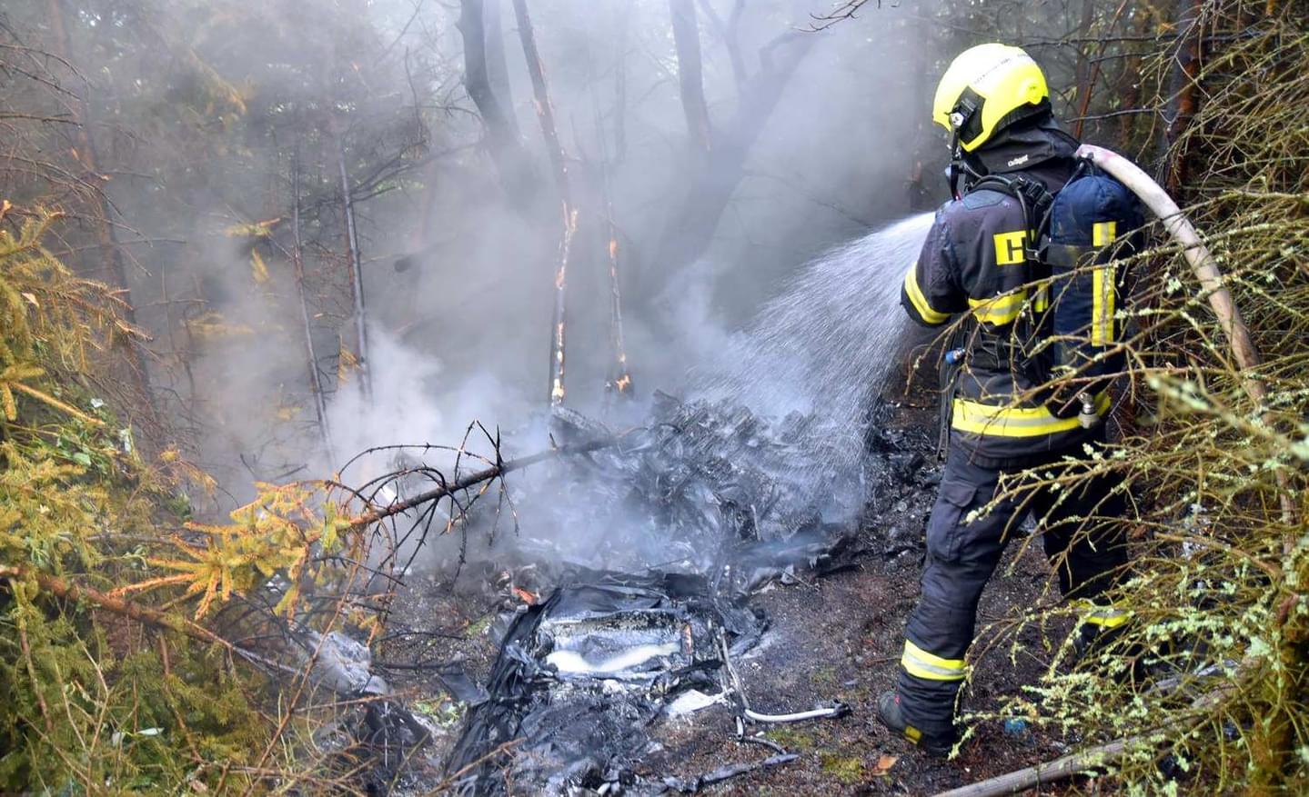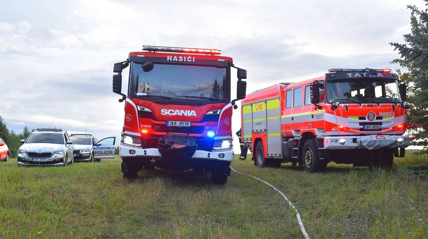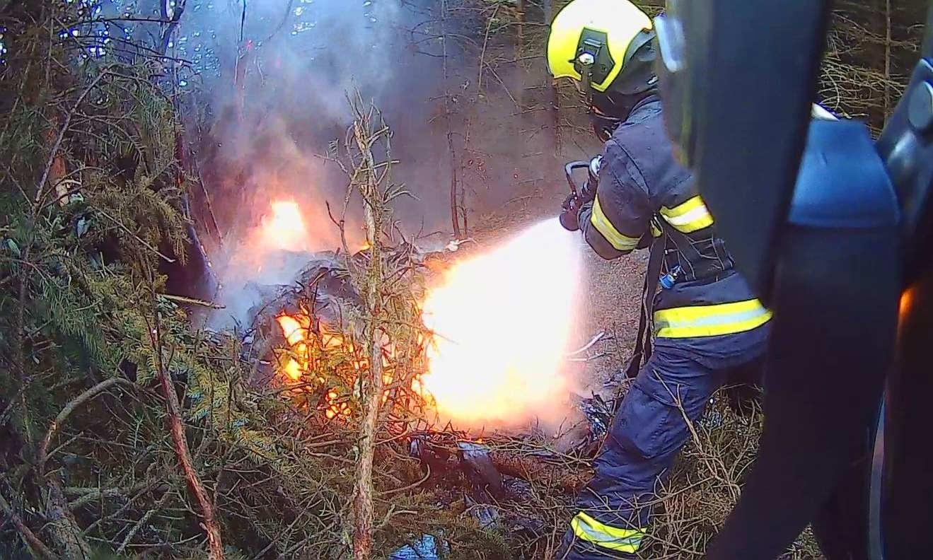K požáru vyjely tři jednotky hasičů, záchranáři a samozřejmě i policisté. "Při příjezdu prvních jednotek na místo byl požárem již zasažený celý stroj. Hasiči okamžitě zahájili hasební práce a poskytli ošetření dvěma osobám, které následně předali kolegům ze Zdravotnické záchranné služby. Oheň zasáhl také přilehlý lesní porost," uvedli hasiči.
