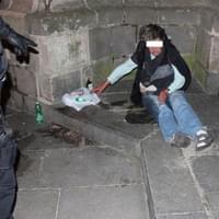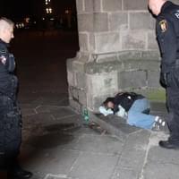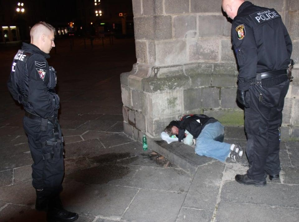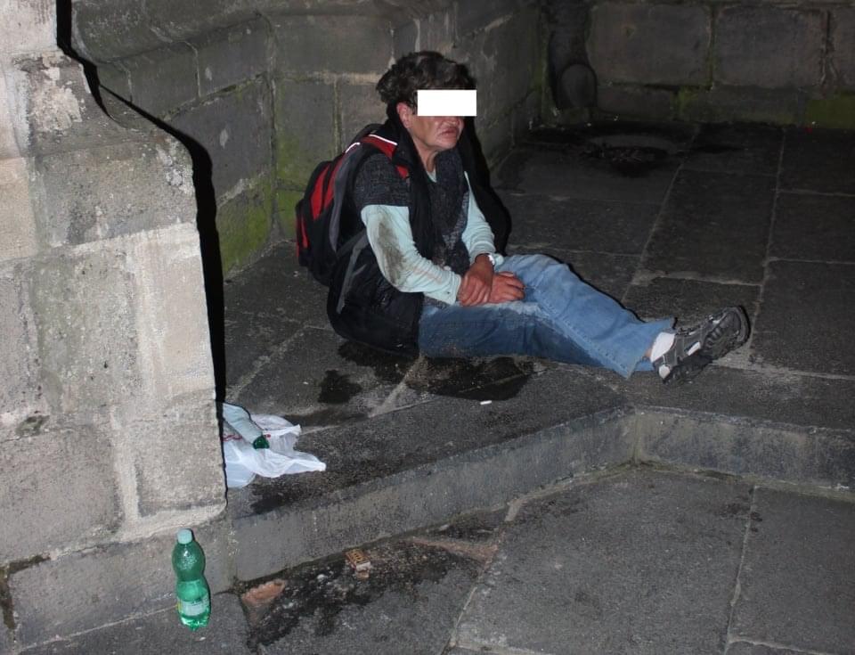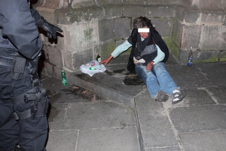Během výše uvedeného zákroku oznámila hlídce mladá dívka, že u kostela na náměstí zkolabovala zřejmě starší žena. Strážníci okamžitě vyrazili na popsané místo, ale žena nebyla v ohrožení života, vyjma vlastní snaživé a postupné likvidace sama sebe alkoholem. Šlo o místní známou bezdomovkyni a žebračku, která do sebe nalila dvě láhve tvrdého alkoholu, pomočila se a pozvracela (viz foto).