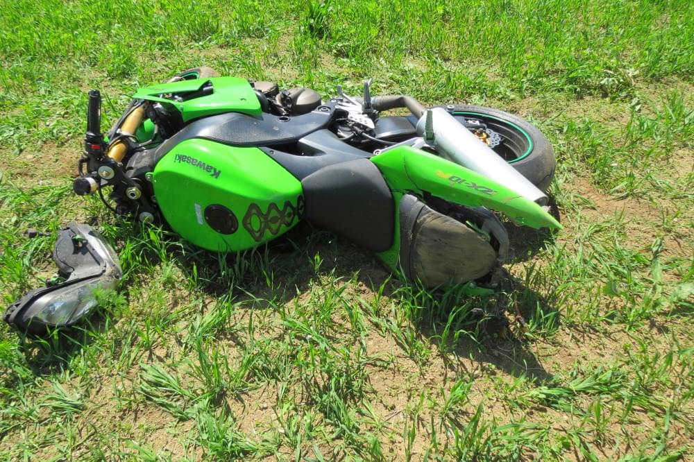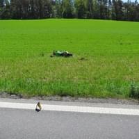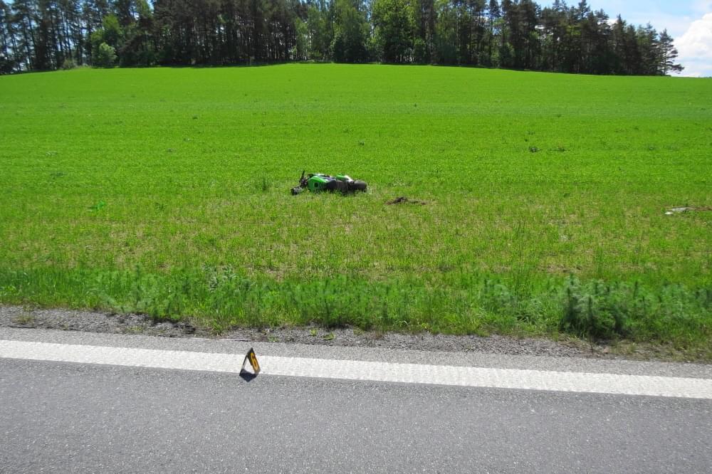 Po střetu zůstal poškozený vůz na silnici, zatímco motocykl byl nárazem odmrštěn do pole.
