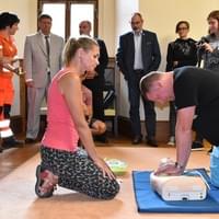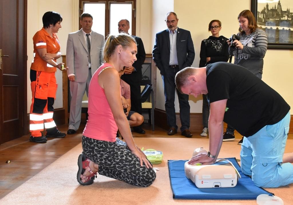 „Přístroj, jehož plný název zní automatický externí defibrilátor (AED), není ve skutečnosti pouhý defibrilátor. Vede zachránce celým průběhem první pomoci, monitoruje životní funkce postiženého a mimo jiné umí vyhodnotit, zda je nutné použít elektrický výboj či nikoli. Dokáže navádět i laika při masáži srdce postiženého tak, aby byla účinná,“ řekl vedoucí odboru krizového řízení Jiří Karas.