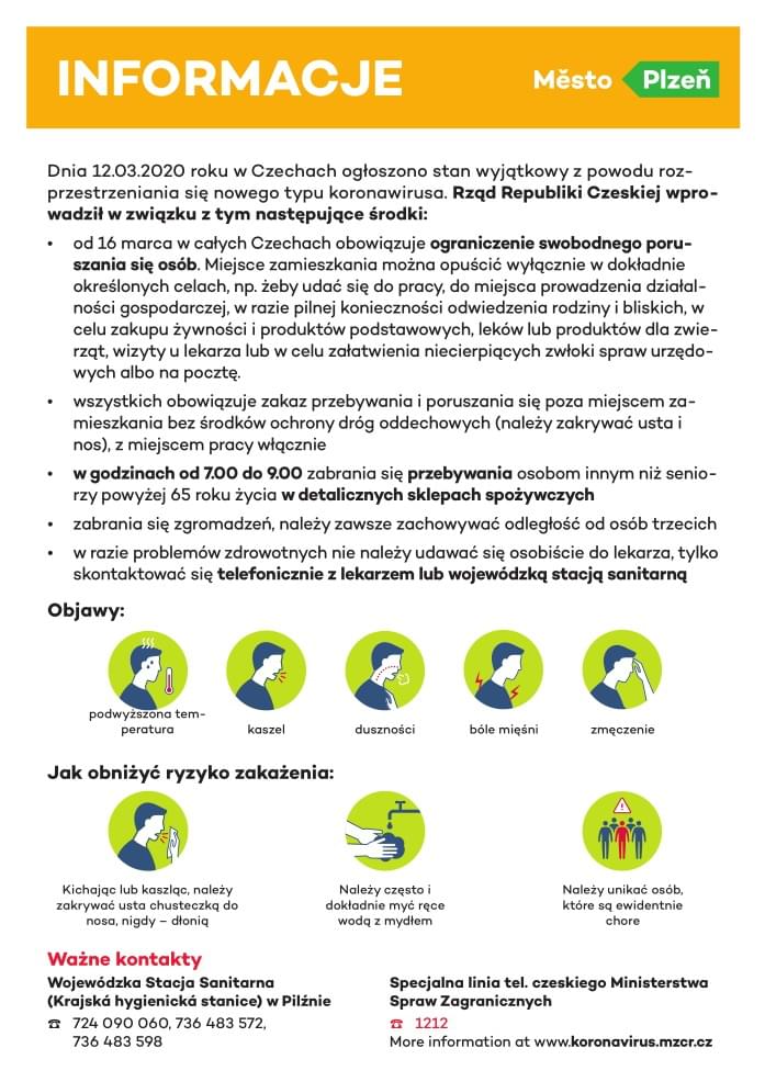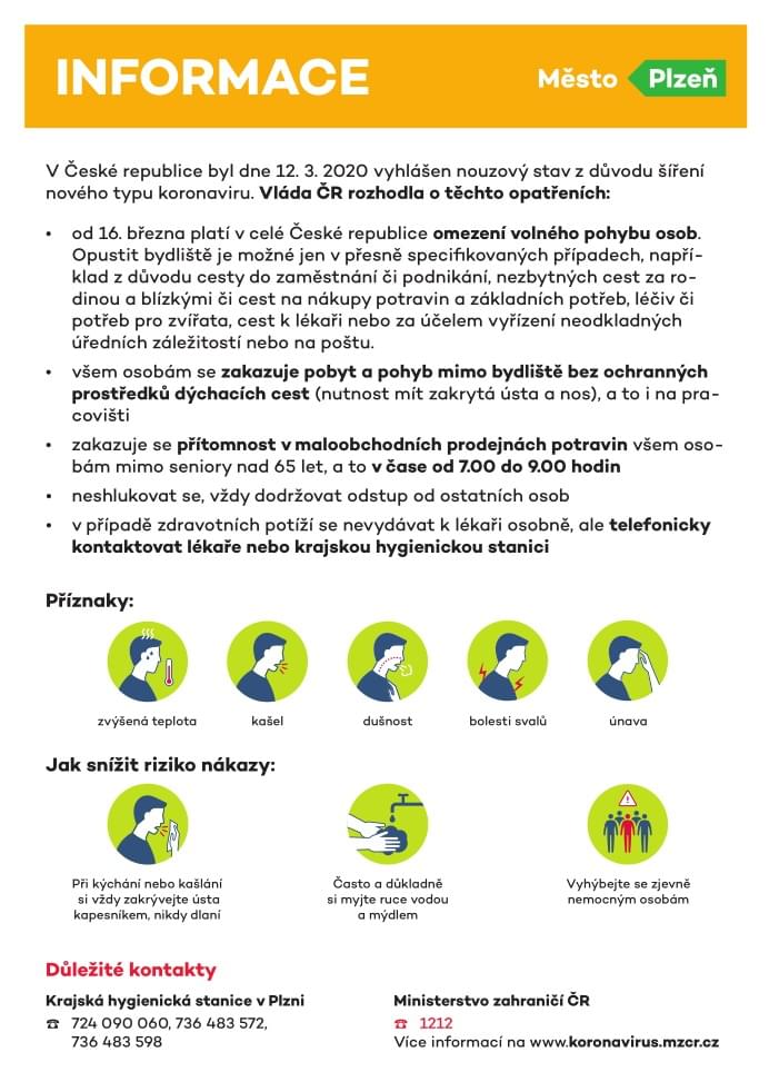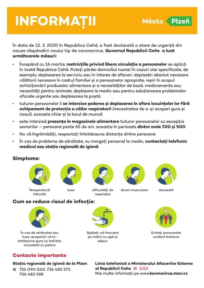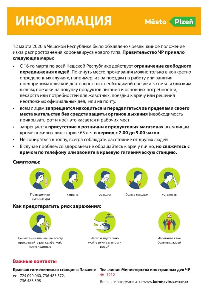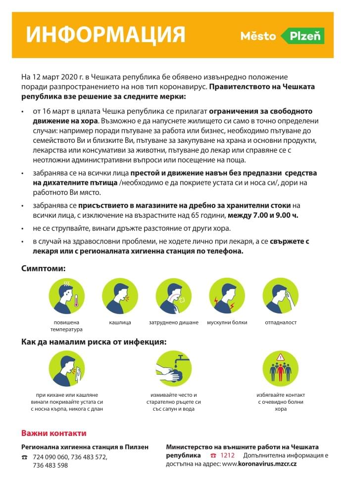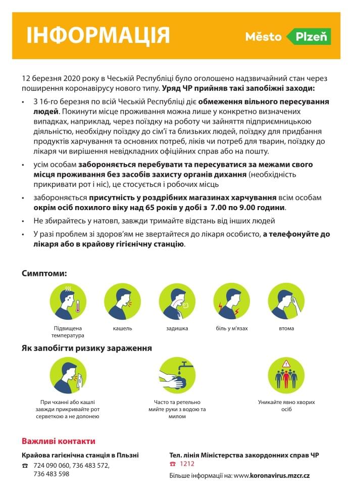 Plzeň informuje cizince v jejich jazyce o opatřeních, která platí v České republice v souvislosti se šířící se epidemií koronaviru. Tisíce letáků v ukrajinštině, ruštině, bulharštině, polštině a rumunštině distribuovalo město na zastávky městské hromadné dopravy, na ubytovny, mezi velké firmy, které zaměstnávají zahraniční pracovníky i na další místa.