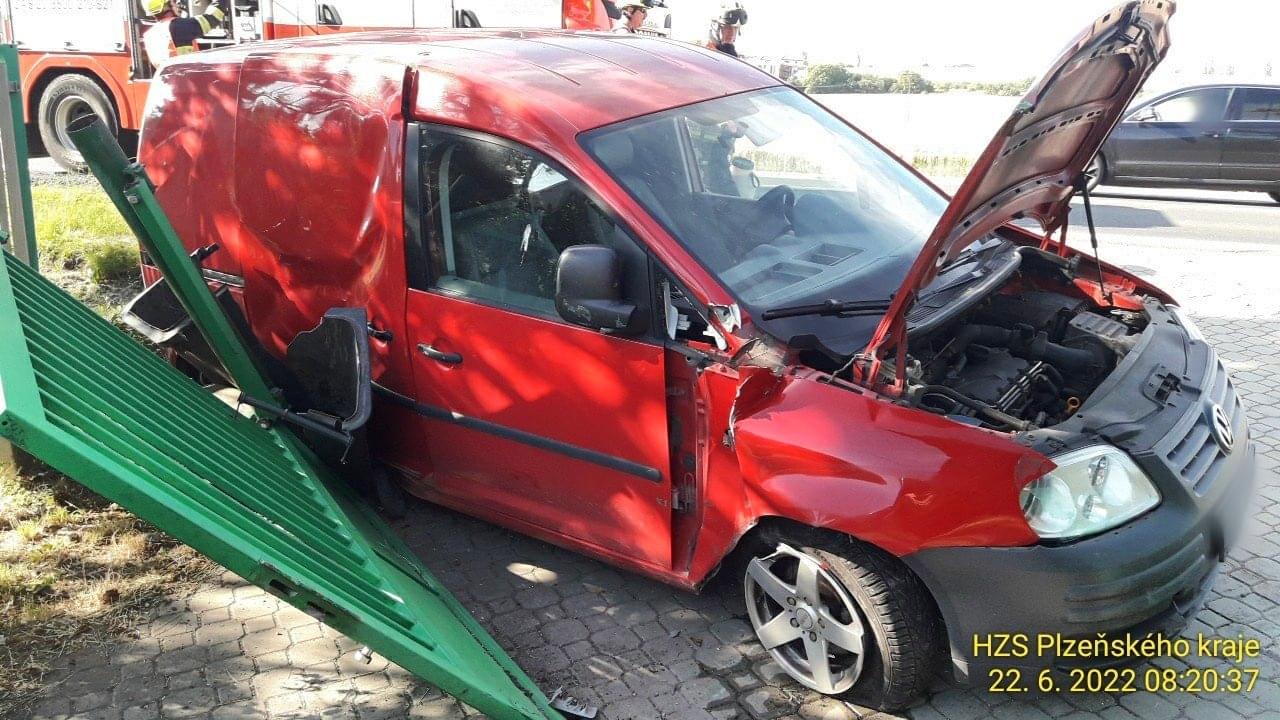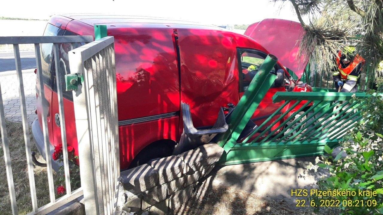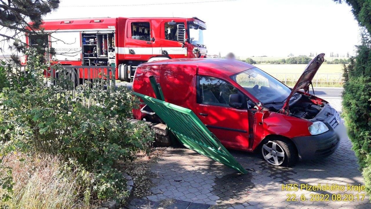 Dnes po osmé hodině ráno došlo v Plzni Křimicích k dopravní nehodě, po které osobní vůz prorazil vrata na pozemek rodinného domu a zůstal stát ve vjezdu.