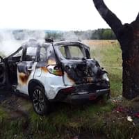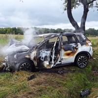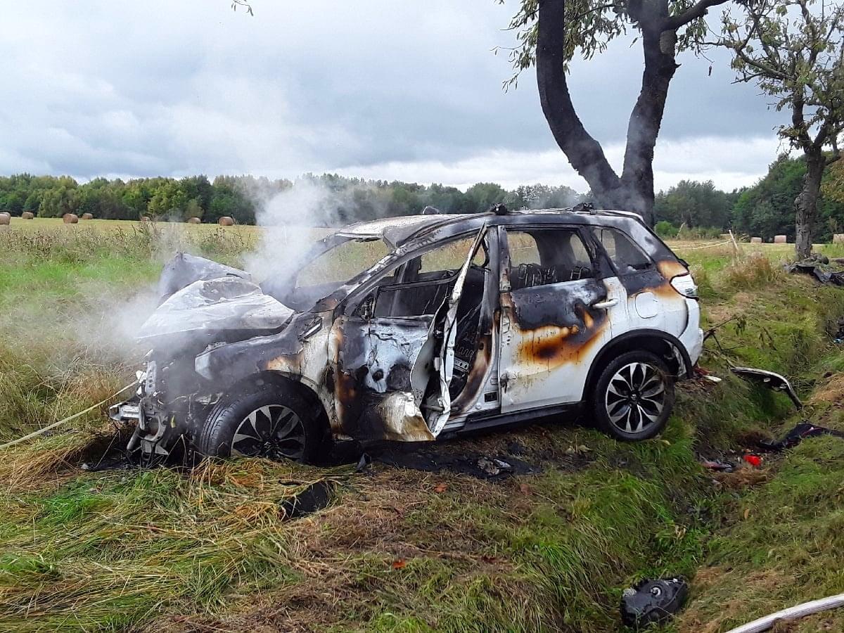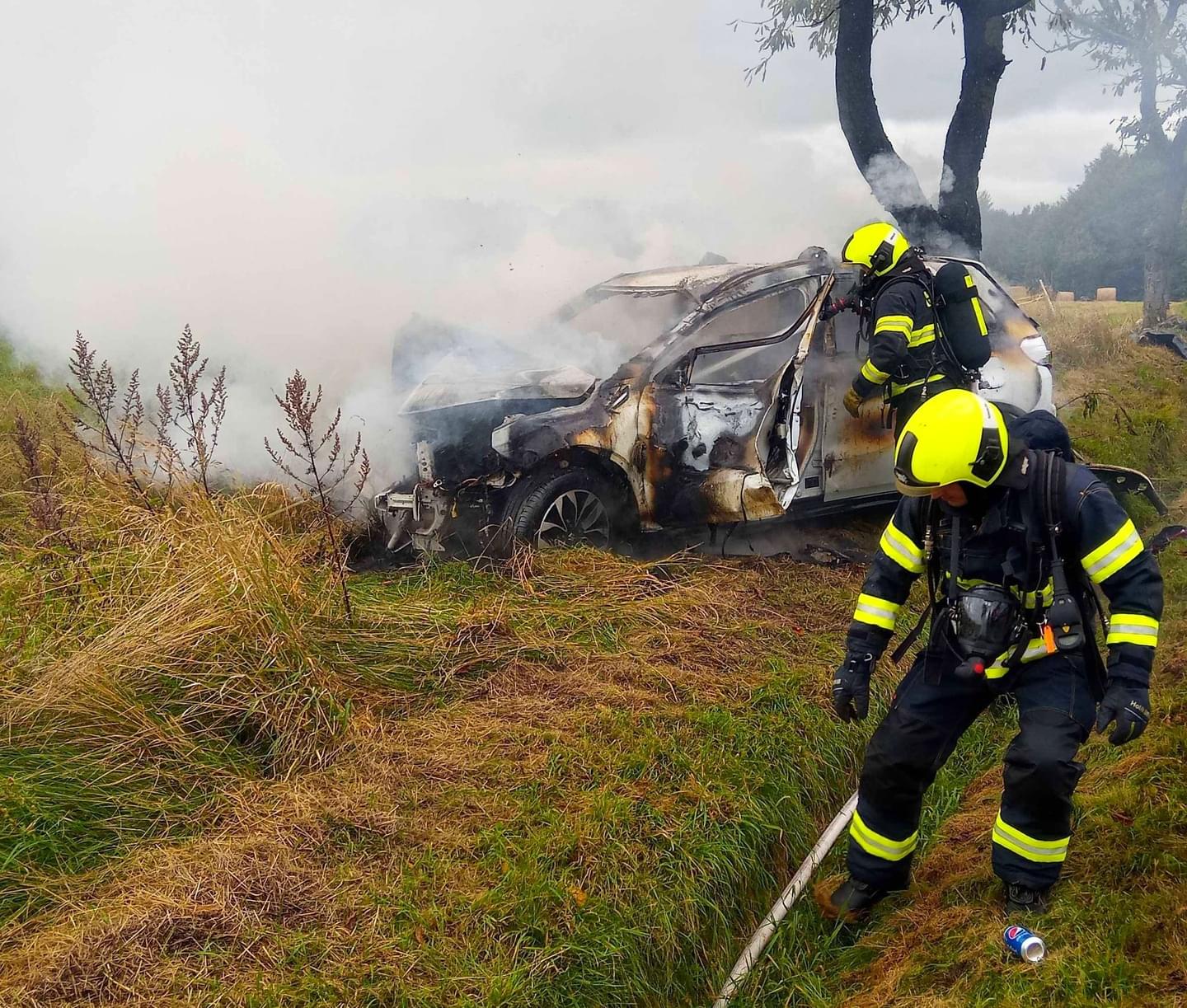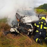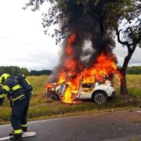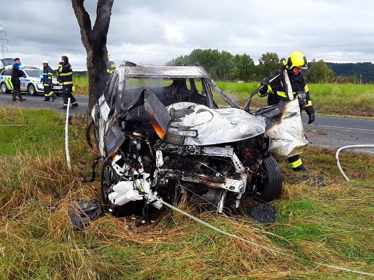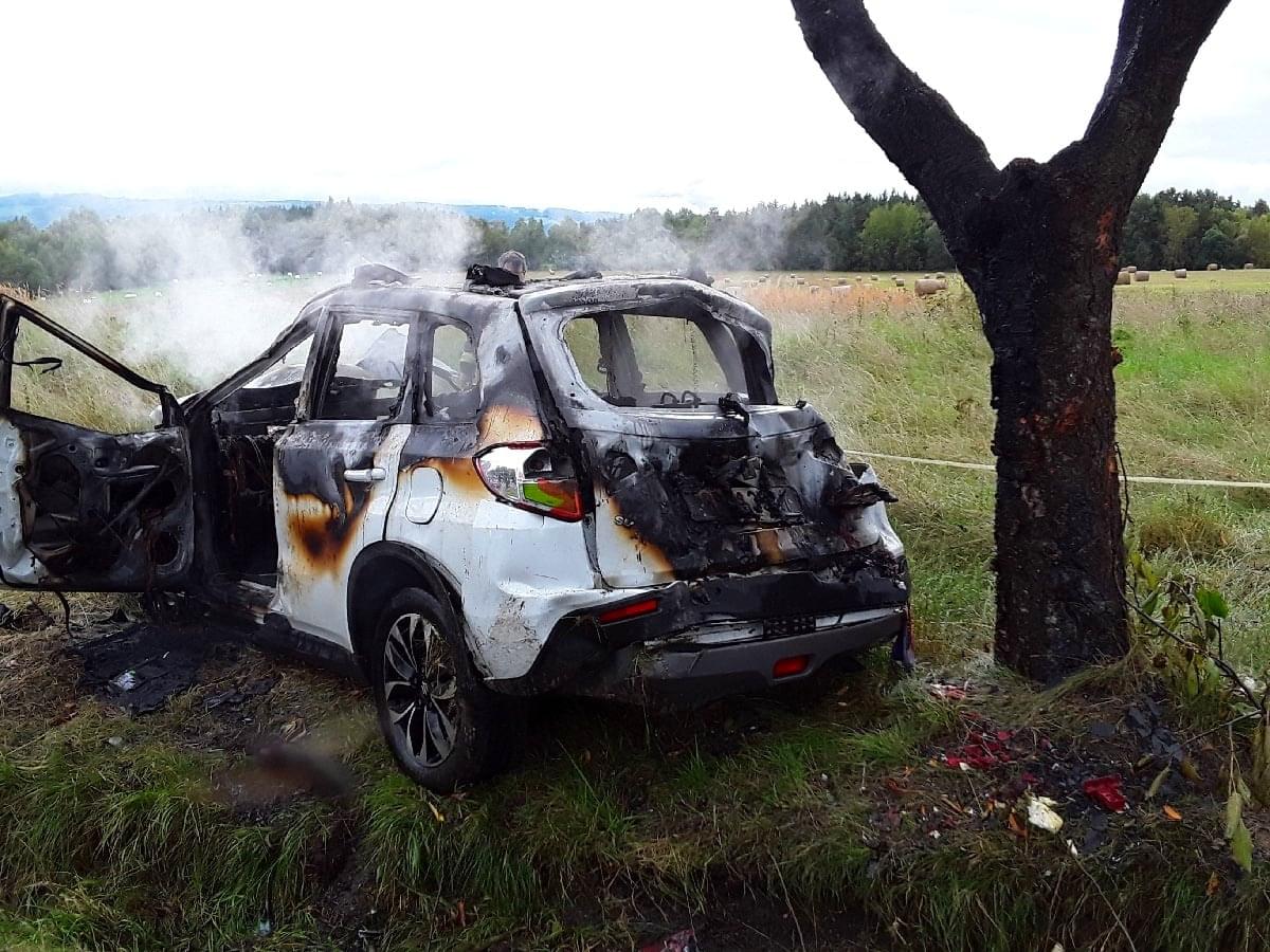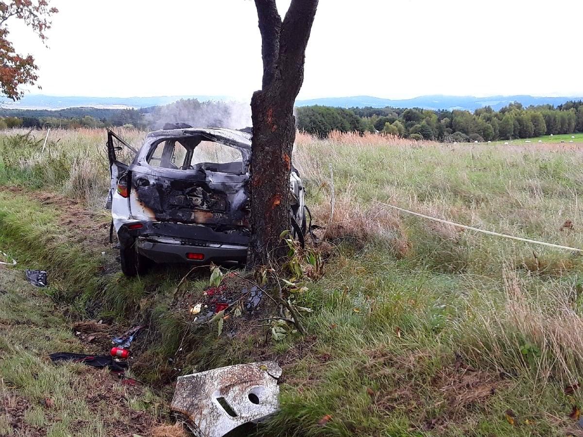 Včera krátce před jednou hodinou odpoledne došlo na silnici třetí třídy poblíž Krajkové na Sokolovsku k dopravní nehodě, po které skončil osobní vůz ve stromě a v plamenech. "Čtyřicetiletý řidič osobního automobilu Suzuki jedoucí ve směru od Krajkové na Josefov nerespektoval dopravní značení, konkrétně podélnou souvislou čáru a předjel jiné vozidlo. Po zařazení zpět do pravého jízdního pruhu ale dostal smyk a vyjel mimo pozemní komunikaci. Poté postupně narazil do sloupu telefonního vedení, směrového sloupku, dvou stromů a ohradníku," popal tiskový mluvčí policie s tím, že po havárii začal vůz také hořet.