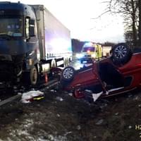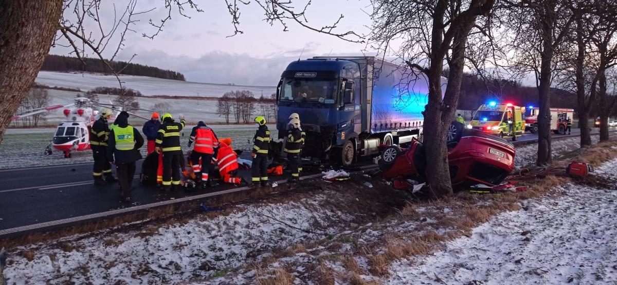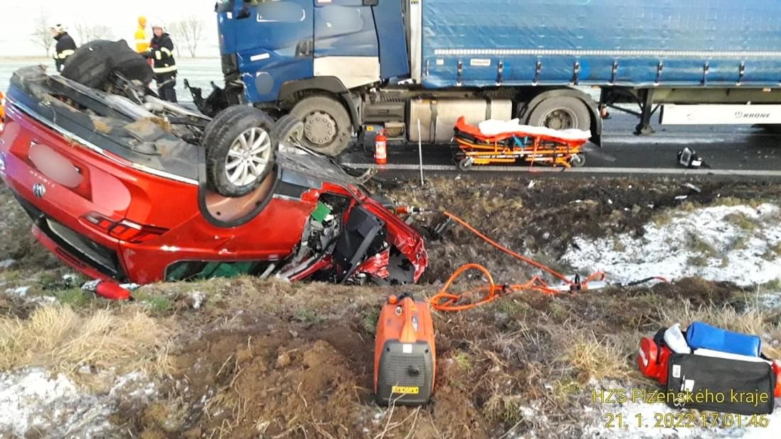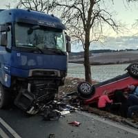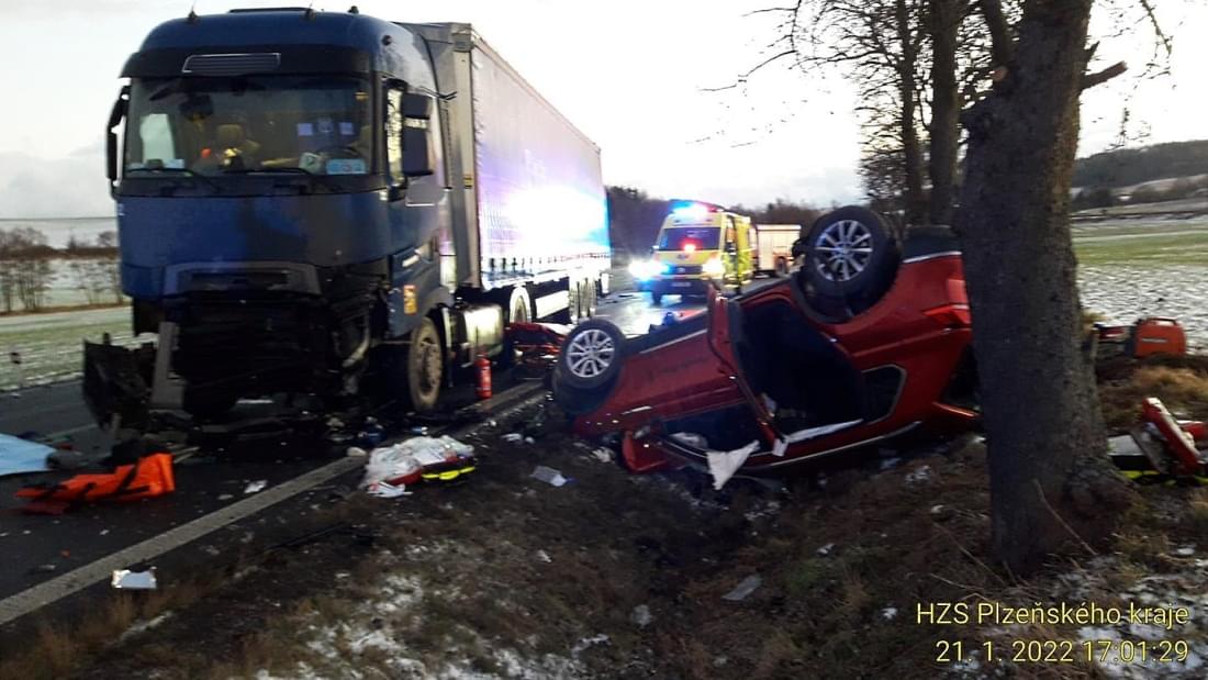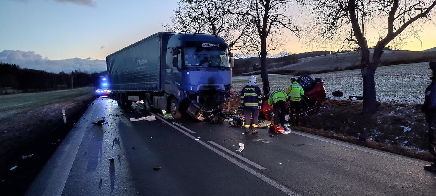 V pátek krátce před pátou hodinou odpoledne došlo mezi Dehtínem a Kokšínem na Klatovsku ke střetu osobního vozu s nákladním. "Z dosavadního šetření vyplývá, že řidič narozený v roce 1995 s vozem Volkswagen při průjezdu zatáčky nepřizpůsobil rychlost jízdy, na mokrém povrchu se vozidlo dostalo do smyku a přejelo do protisměru, kde došlo k čelnímu střetu s nákladním automobilem s návěsem řidiče narozeného v roce 1984," popsala tisková mluvčí policie s tím, že po střetu skončil návěs napříč přes oba jízdní pruhy a osobní auto převrácené v příkopu.