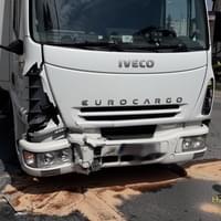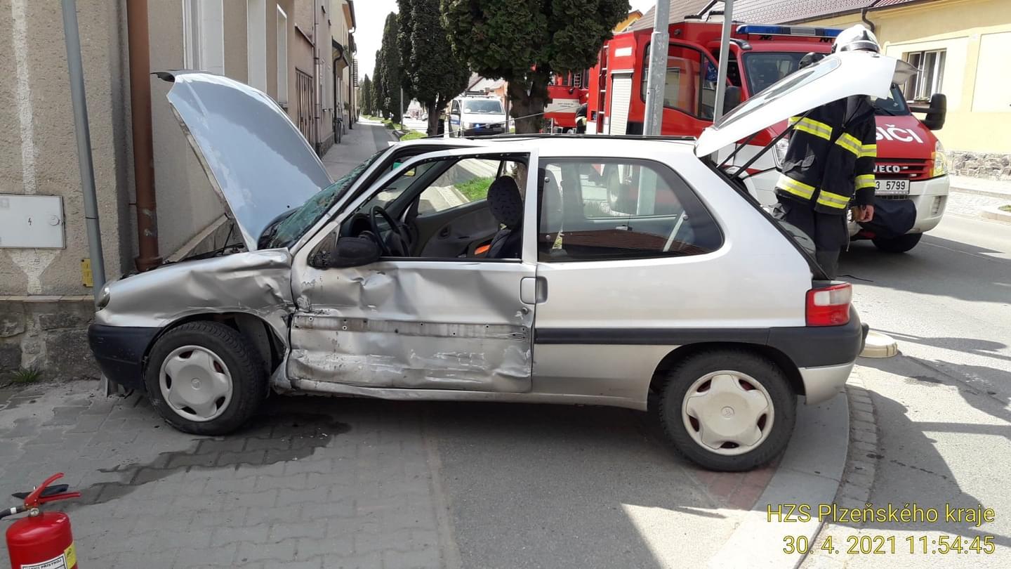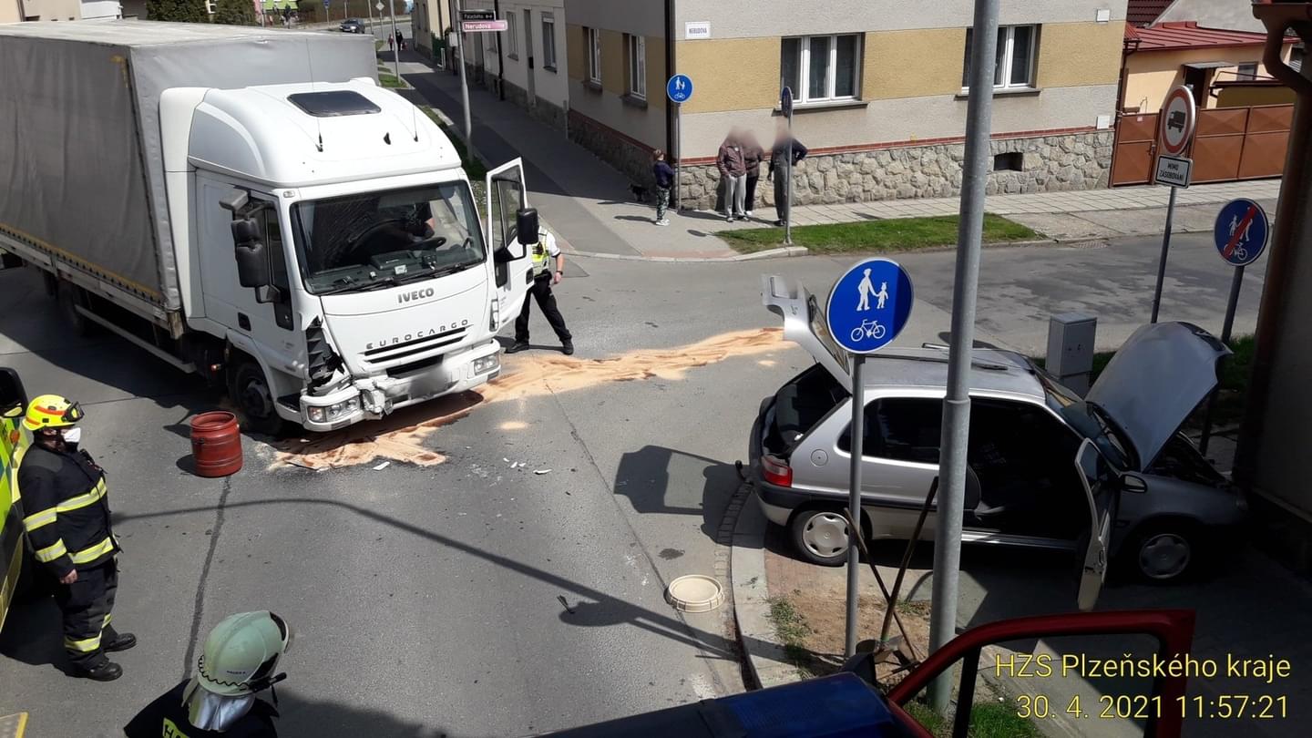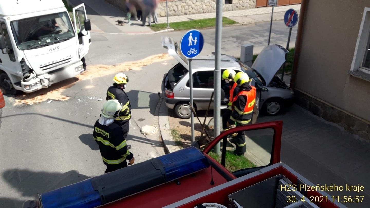 Dnes před polednem došlo na křižovatce Palackého a Kotkovy ulice v Přešticích k dopravní nehodě, při které se střetl nákladní vůz Iveco s osobním autem Citroen, které bylo po střetu navíc odmrštěno na stěnu domu.