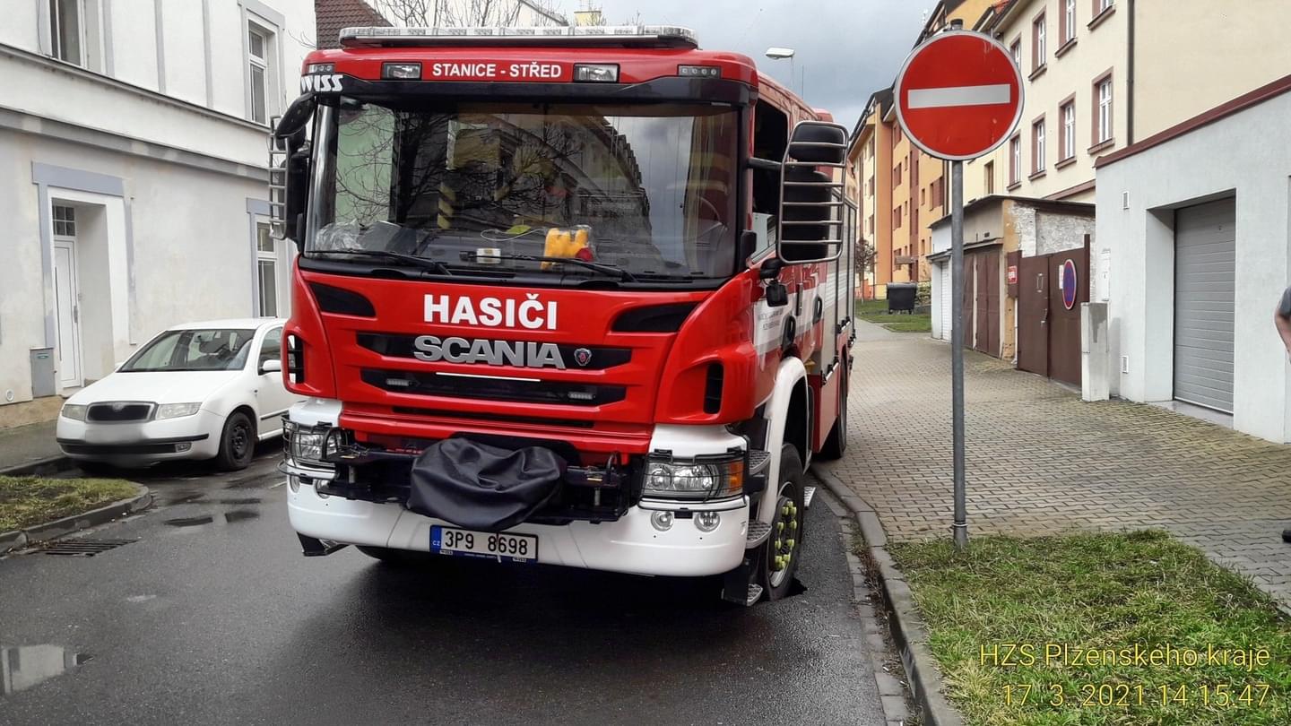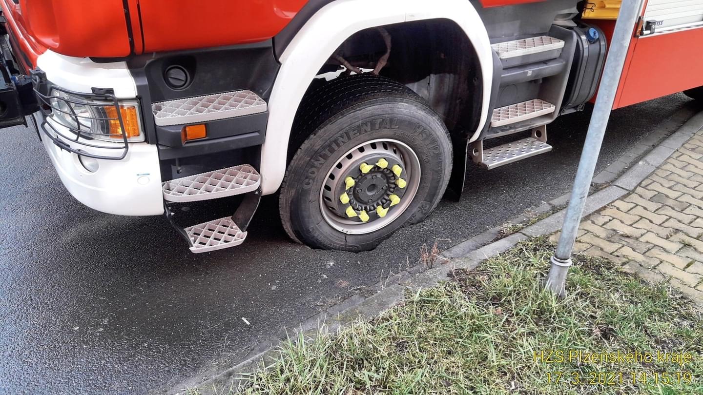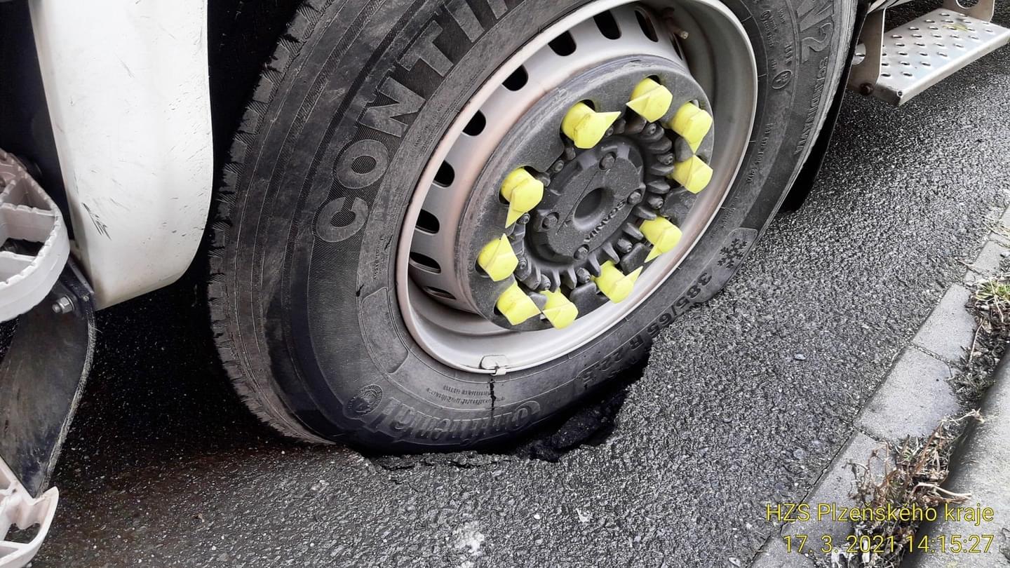 Dnes odpoledne kolem půl druhé vyjížděli hasiči z Plzně-středu na pomoc záchranářům do Bělohorské ulice v Plzni. Při odjezdu z místa se však pod jejich cisternou částečně propadla vozovka. "Velitel si na pomoc povolal vyprošťovací vozidlo z Košutky a nyní se ve spolupráci se správcem komunikace řeší nejšetrnější způsob vyproštění. Nevíme totiž jak vypadá podloží pod propadlým kolem, například, zda se pod vozovkou nevytvořila kaverna," uvedl mluvčí hasičů.