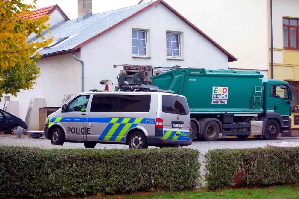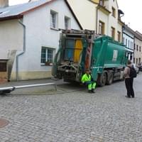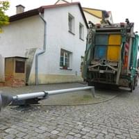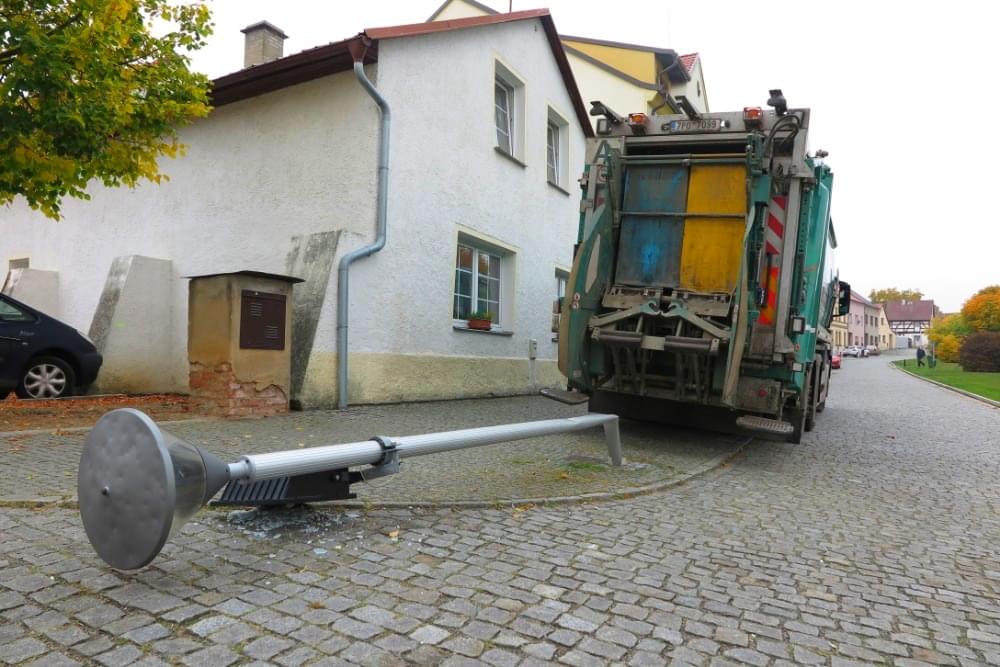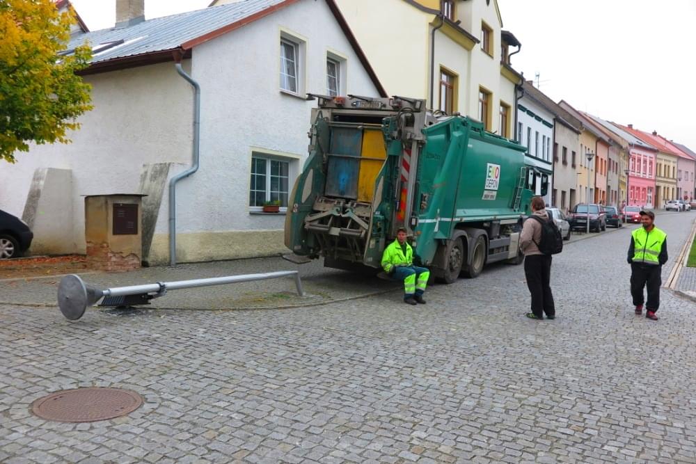 Popelářský vůz zde nacouval do lampy pouličního osvětlení, kterou zlomil a skácel na chodník.