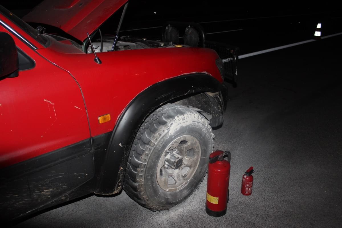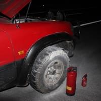 - Zahájit hašení - tedy pokud máte kvalitní hasicí přístroj, ten sice není povinný, ale my ho považujeme za naprosto nezbytný. Před hašením nedoporučujeme otevřít víko motoru úplně, oheň získá přísun vzduchu a okamžitě se rozšíří, lepší je jen mírně nadzdvihnout a stříkat pod ní. My vozíme jeden malý a jeden velký hasicí přístroj. Na uhašení požáru stačil ten malý, ale velký se nechal preventivně připravený vedle vozu.