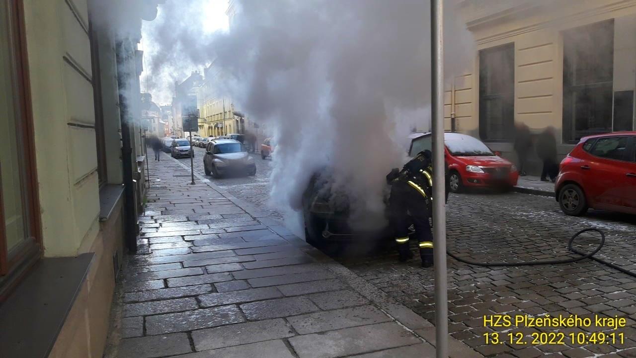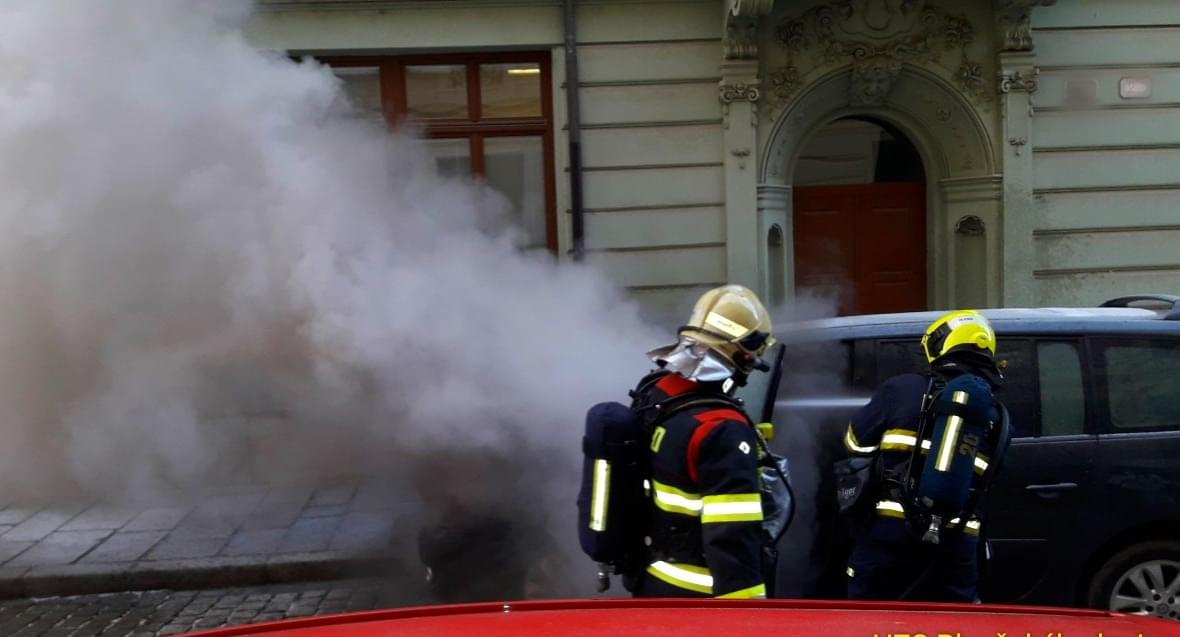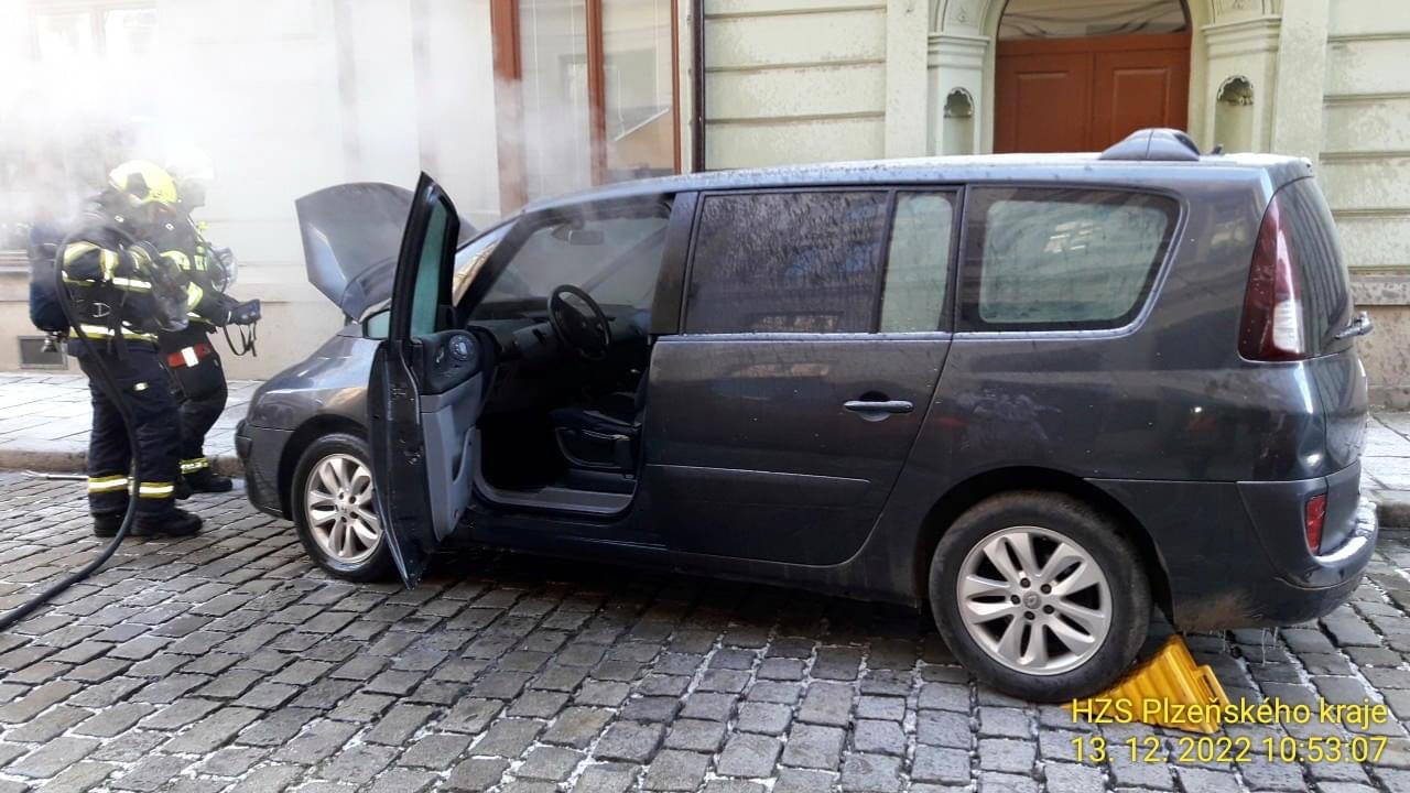 Dnes před desátou hodinou dopoledne došlo v Dominikánské ulici v Plzni k zahoření motorového prostoru vozu Renault Espace.