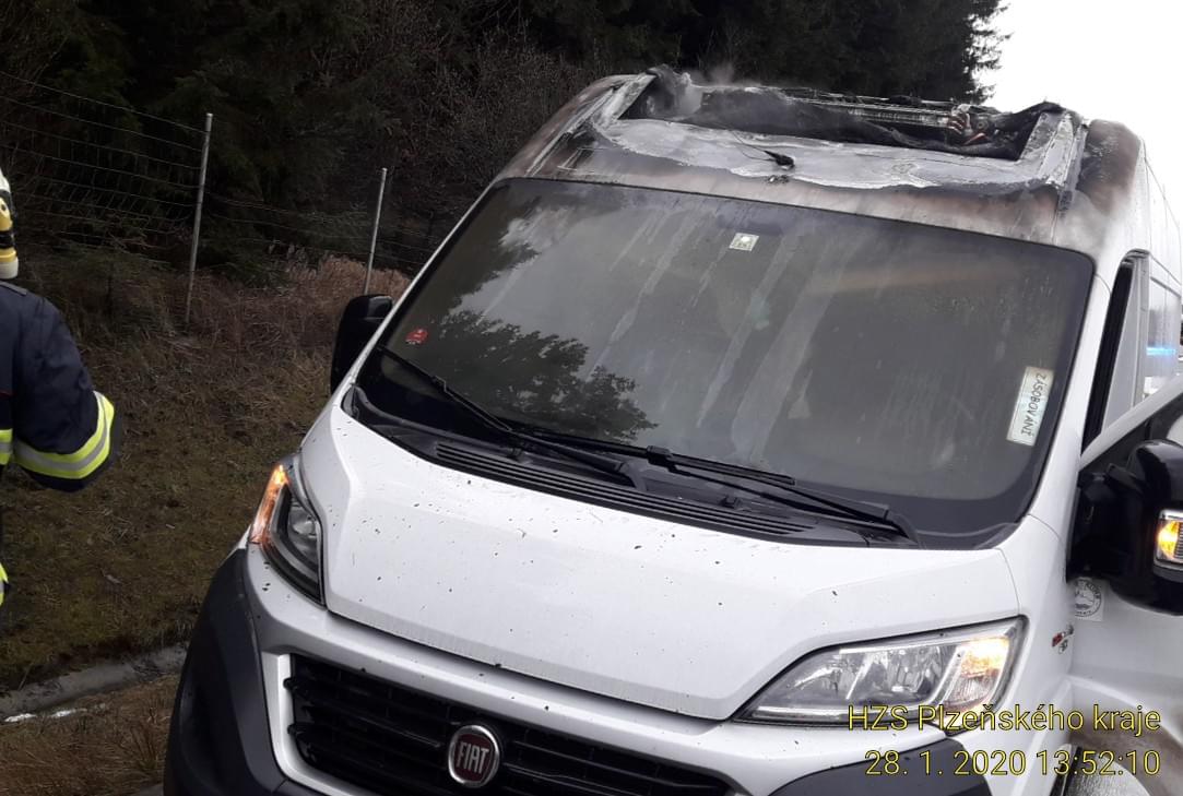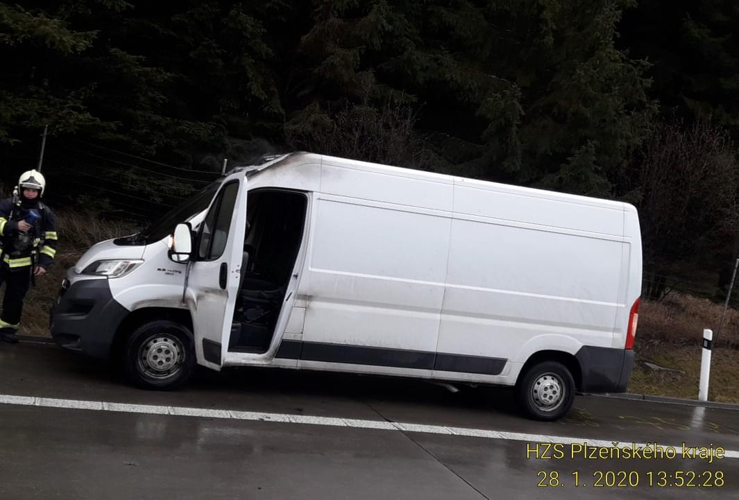 Dnes odpoledne kolem půl druhé došlo na 139 kilometru dálnice D5, tedy zhruba na úrovni Přimdy, ve směru od Rozvadova na Plzeň, k požáru dodávky Fiat.