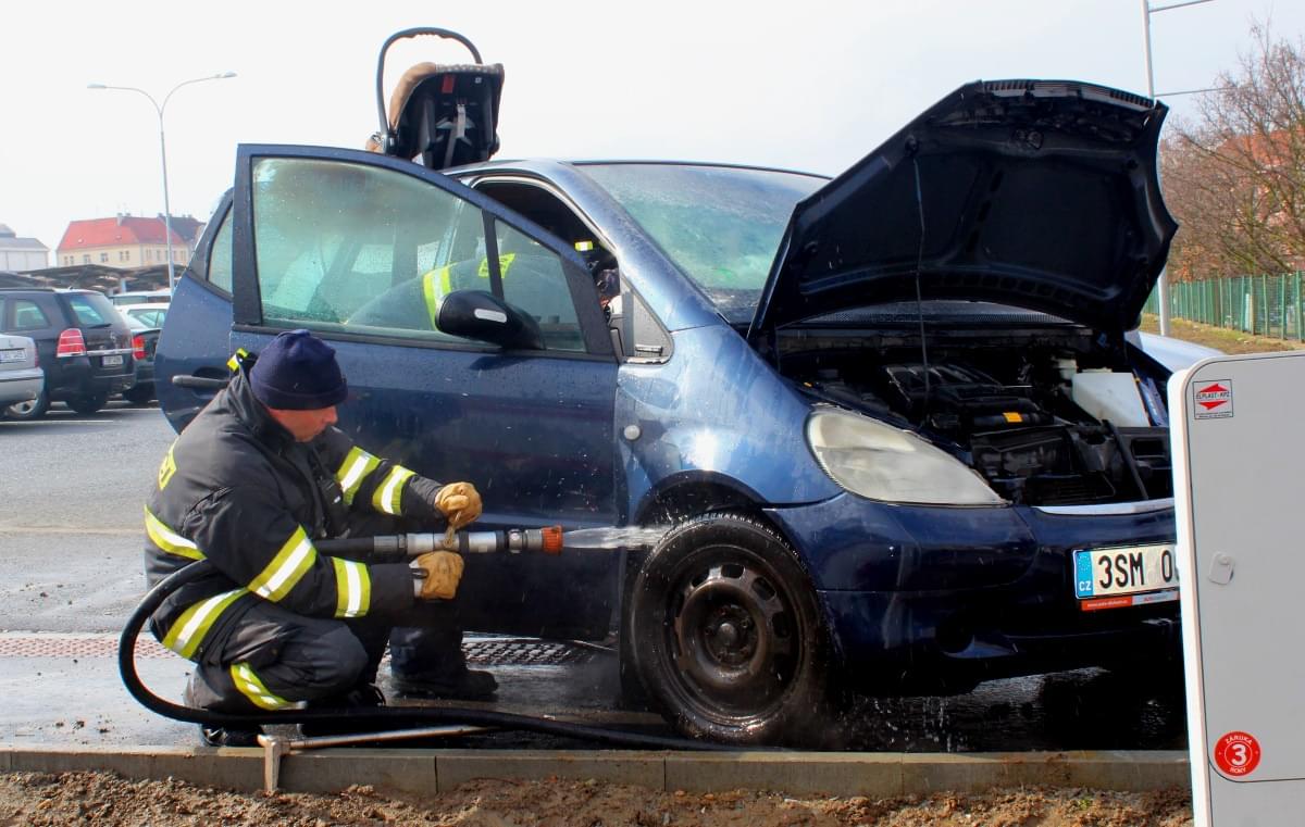 K požáru osobního automobilu vyjížděli hasiči dnes před jednou hodinou odpoledne na parkoviště v Kotkově ulici v Plzni.