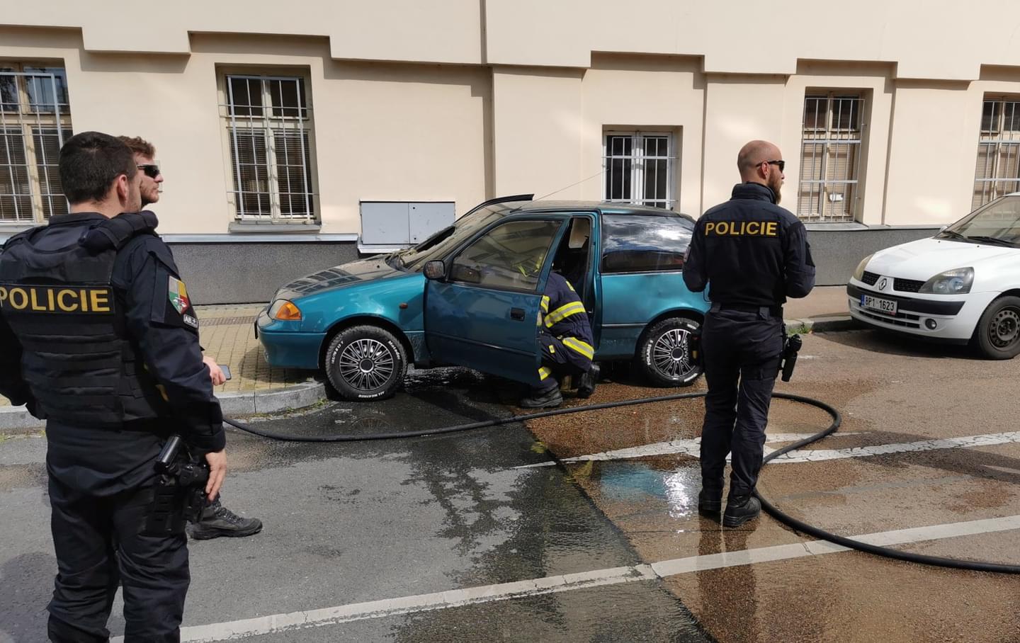 Na místo okamžitě vyjeli hasiči i policisté, ale ještě před jejich příjezdem na pomoc vyrazil s hasicím přístrojem strážný z místního Casina. Bohužel požár v tu chvíli byl tak silný, že hasicí přístroj již na uhašení vozu nestačil.