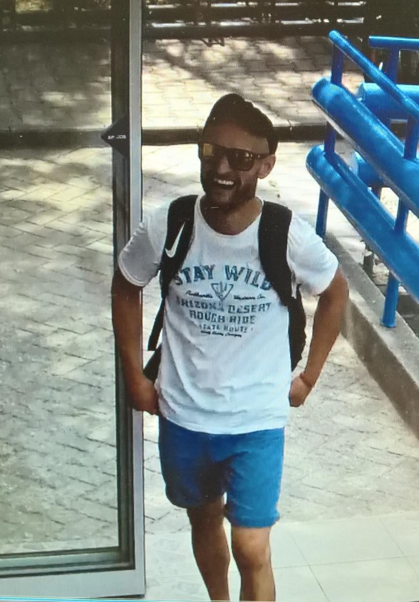 Jedná se o muže ve věku 20 až 30 let, štíhlé postavy vysoké 160-170 cm, s plnovousem a krátce střiženými vlasy. Na sobě měl oblečené modré kraťasy, bílé tričko s krátkým rukávem na hrudi s nápisem Stay Wild, na hlavě kšiltovku a na očích měl nasazené sluneční brýle. Na zádech nesl batoh značky Nike.