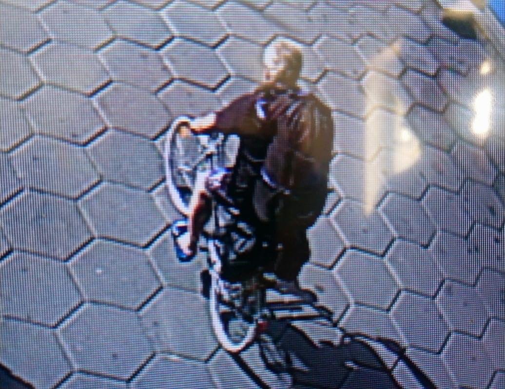 Může se pohybovat na stříbrném dámském kole se svařovanou zadní částí s černou taštičkou upevněnou na sedle.