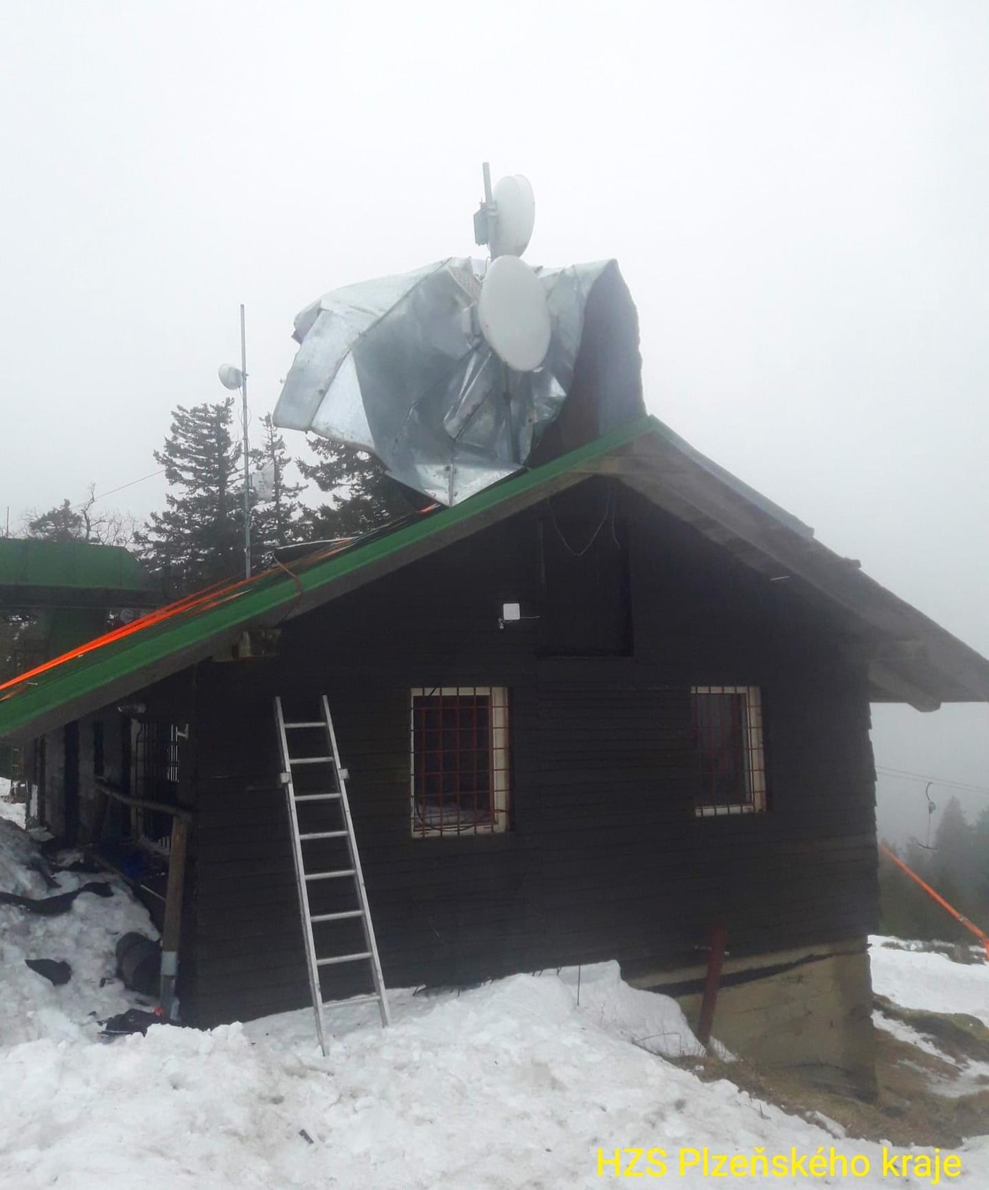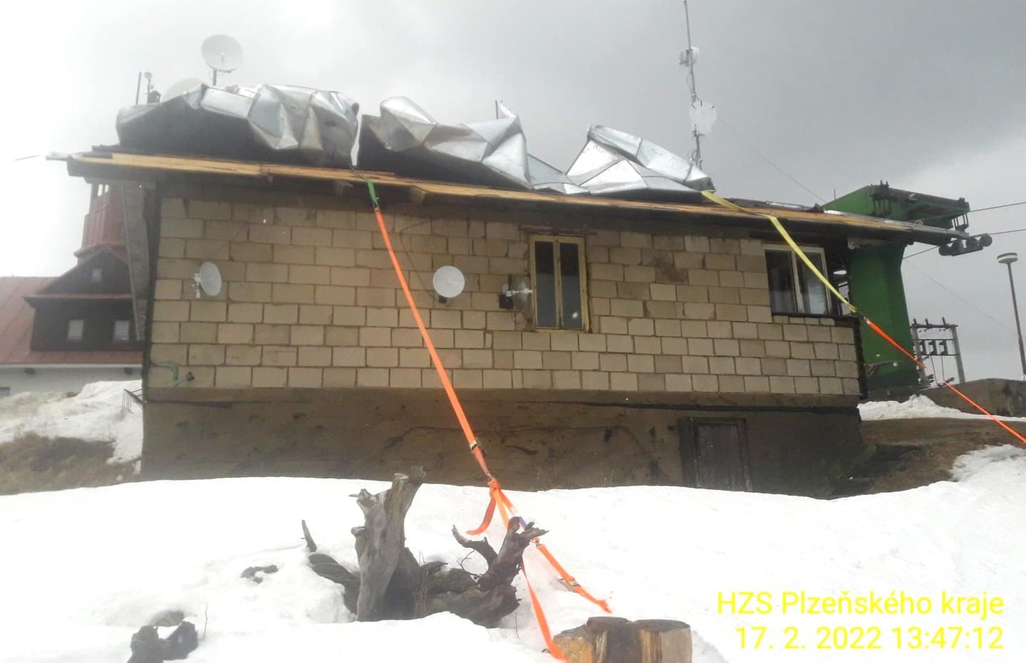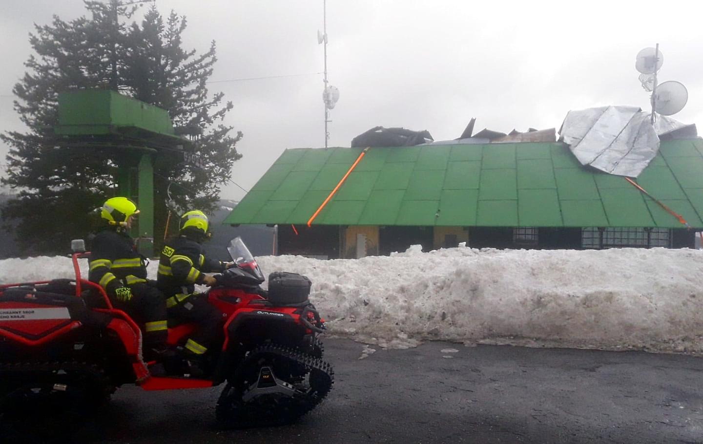 14:00 Bohužel vítr neustává a hasiči stále vyrážejí k dalším a dalším zásahům. Zatím poslední zpráva přišla z Pancíře, kde hasiči zajišťovali utrženou střechu obslužny lyžařského vleku.