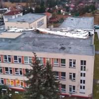 V Horní Bříze došlo kromě pádu stromu na auto i ke zničení střechy na základní škole.