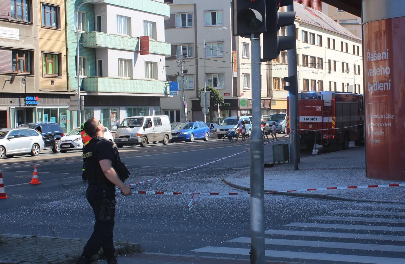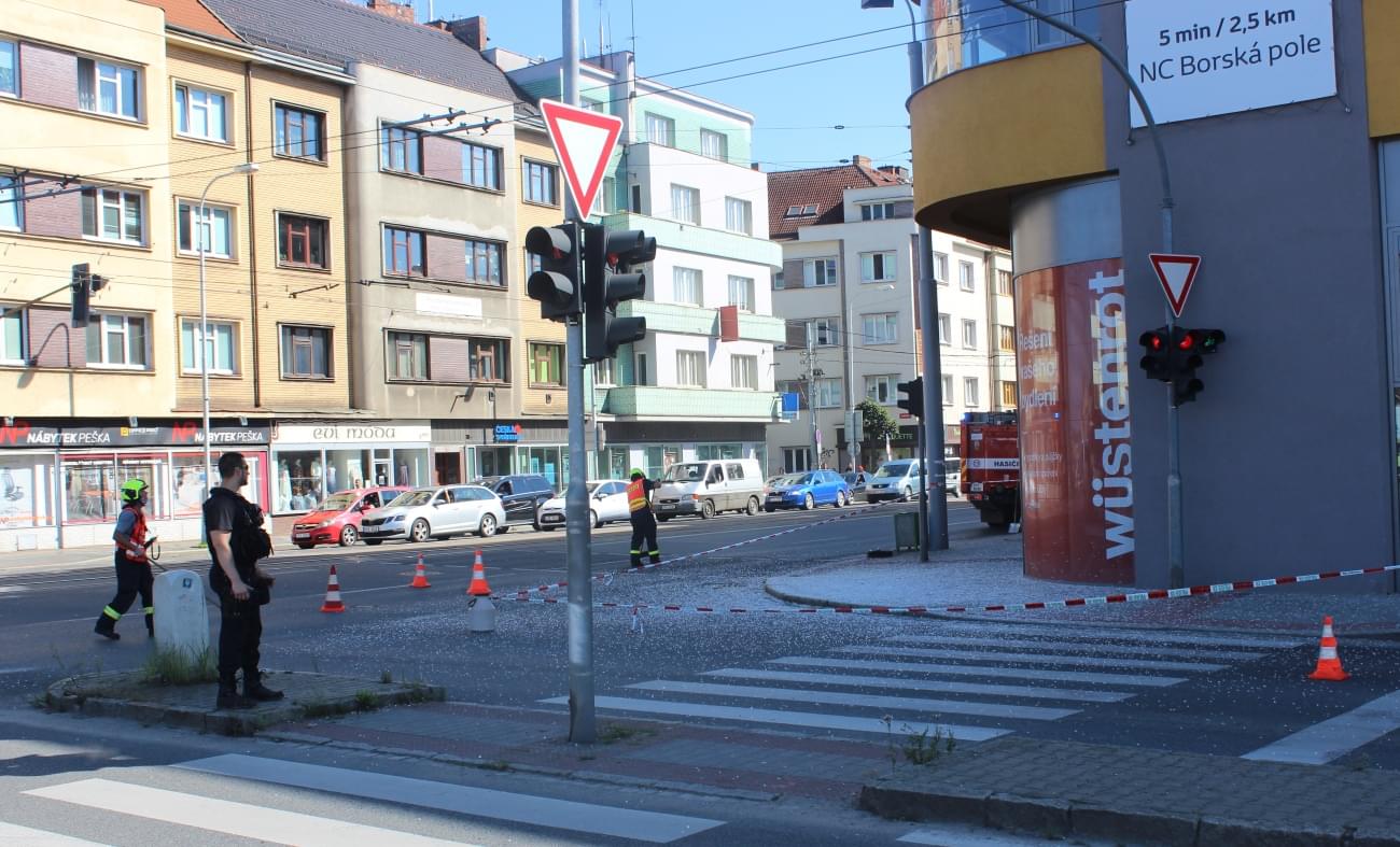 Hasiči se zodpovědnou osobou vstoupili do budovy a pomocí háků museli celé vnější sklo strhnout. Po dobu zásahu samozřejmě museli policisté částečně celou křižovatku uzavřít, což v odpoledním provozu okamžitě způsobilo dlouhé zácpy a bohužel minimálně v jednom případě, na křižovatce Borské a Koperníkovy ulice, došlo kvůli nepozornosti řidičů i k dopravní nehodě.