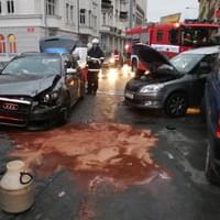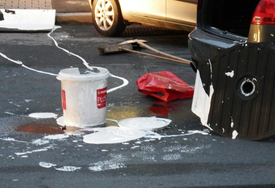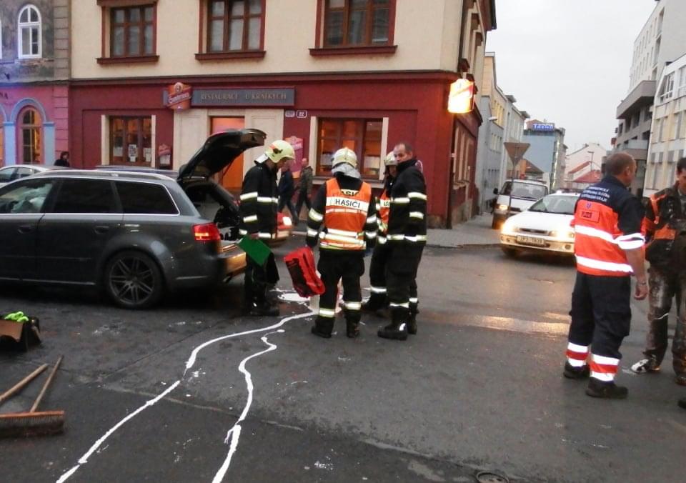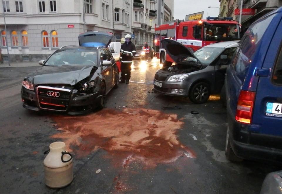 Jedno z vozidel vezlo velkou nádobu s barvou, takže hasiči mají plné ruce práce nejen s běžným odstraňováním následků nehody, ale i se smýváním bílé barvy.