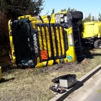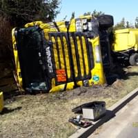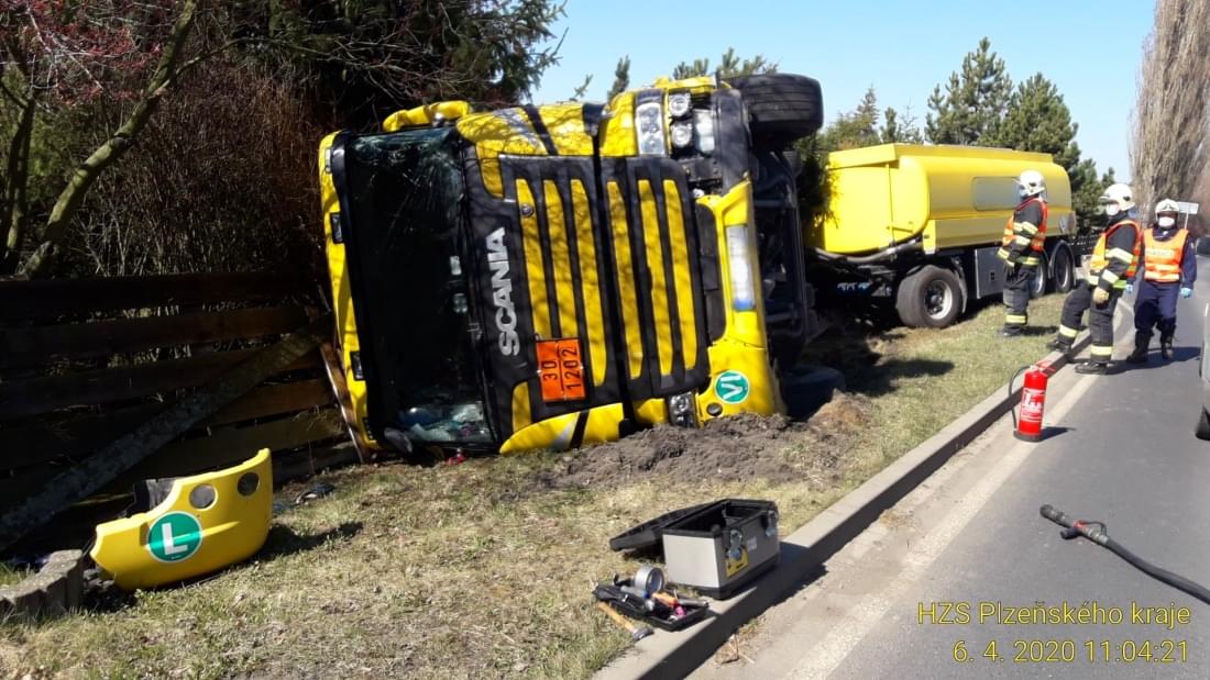 Přední část soupravy se po vyjetí ze silnice převrátila na bok, přívěs zůstal stát na kolech. K úniku nafty naštěstí nedošlo a nehoda se obešla.