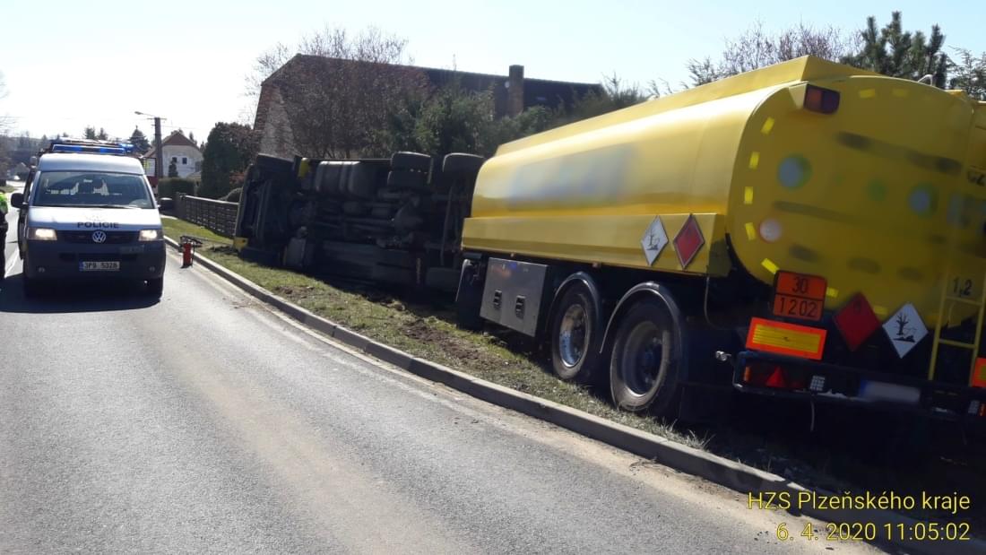 Hasiči a policisté zasahují ve Skašově, kde po půl jedenácté dopoledne došlo k převrácení cisterny převážející 23 tisíc litrů nafty do plotu obytného domu.