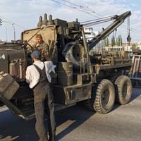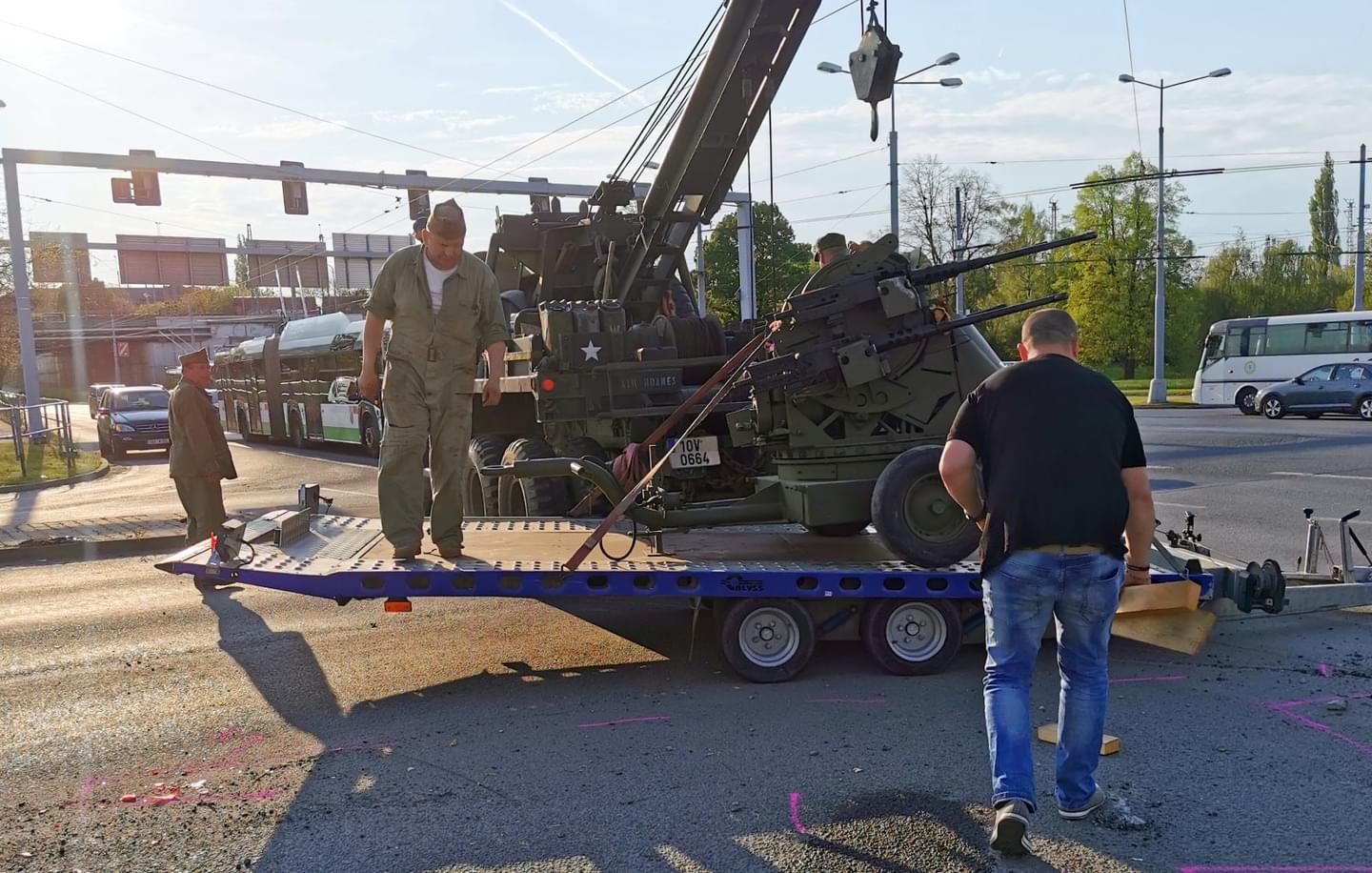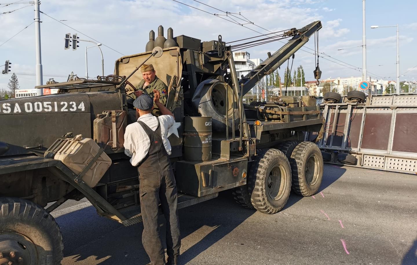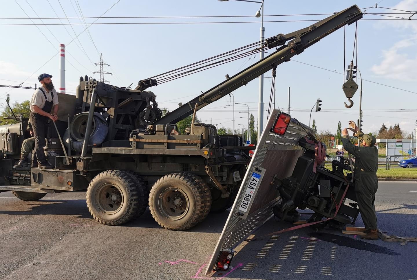 Vojáci pojali vyproštění převráceného nákladu velmi originálně, nevolali ani hasiče ani odtahovou službu, ale z tábora si přivolali svůj taktéž originální americký válečný těžký vyprošťovací vůz M1A1 Ward LaFrance 1000, který za války sloužil k vyprošťování a odtahu poškozených tanků i jiných těžkých vozidel.