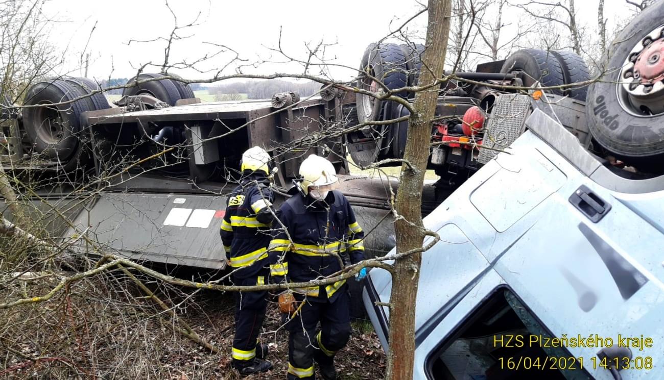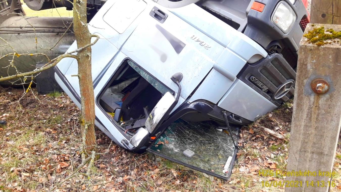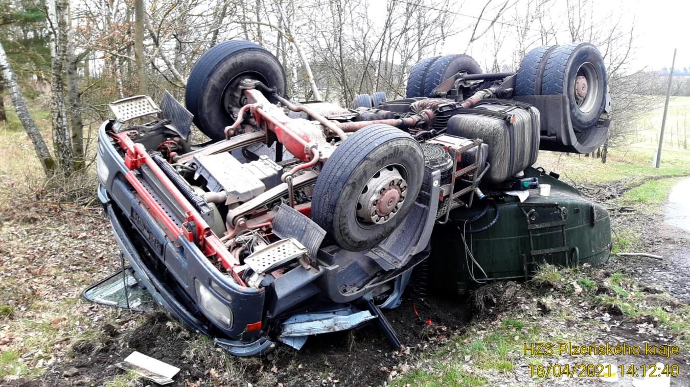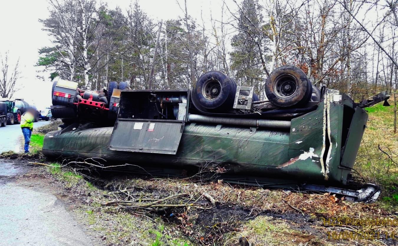 Dnes odpoledne po půl druhé došlo na silnici II/200 mezi Borem a Horšovským Týnem, u odbočky na Strachovice, k havárii cisterny s tahačem značky Mercedes, převážející podle hasičů zřejmě patnáct kubíků močůvky. Vzhledem k tomu, že došlo jednak ke zranění řidiče a také k úniku nafty, na místo vyrazily všechny záchranné složky.