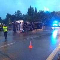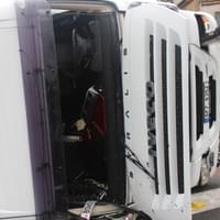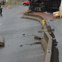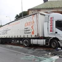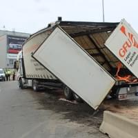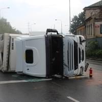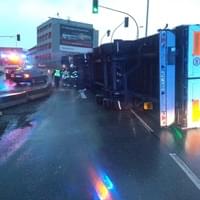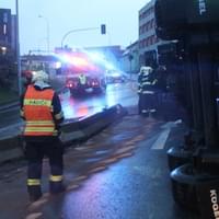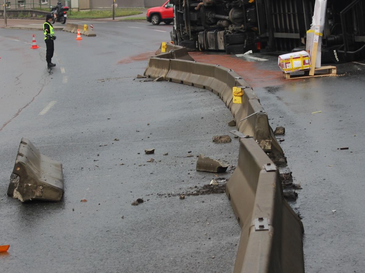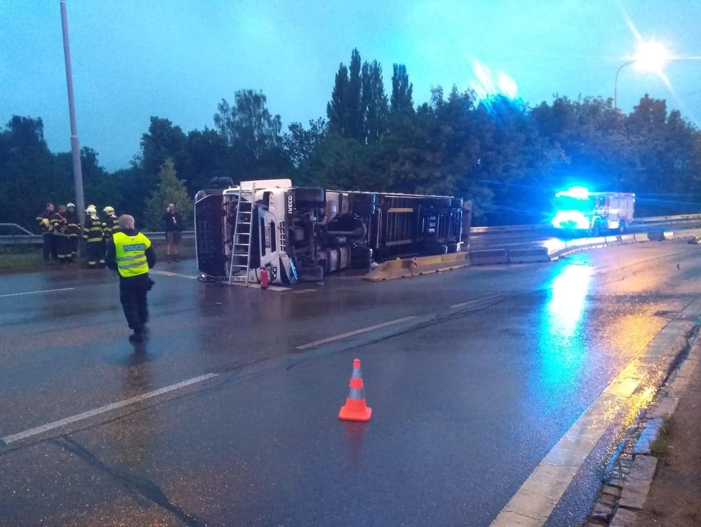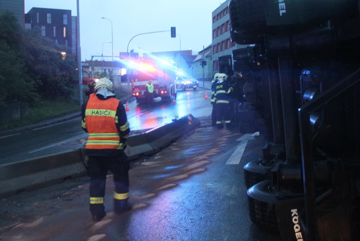 Dnes ráno před čtvrtou hodinou řidič kamionu jedoucí Jízdeckou ulicí v Plzni od centra města směrem k OC Plaza ze zatím neznámých důvodů vyjel z jízdní dráhy, narazil do betonových svodidel a převrátil se.