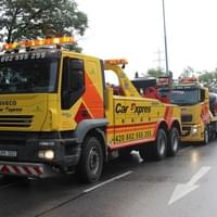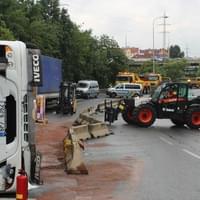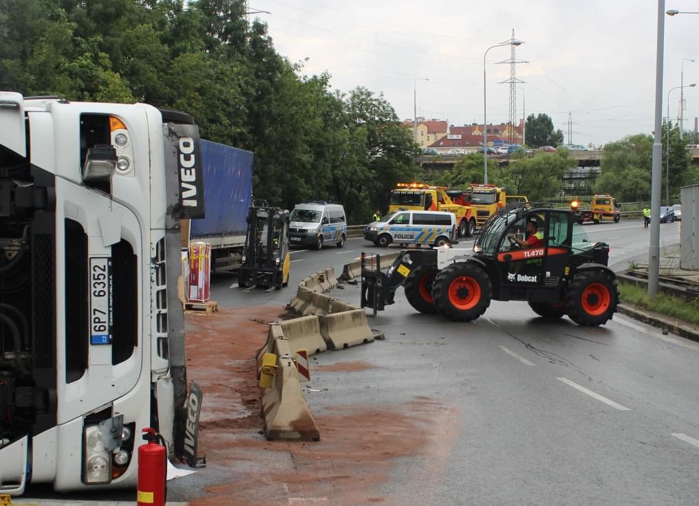 Poté, co specializovaná firma kamion převrátila zpět na kola a provizorně upevnila poničenou plachtu návěsu, byl kamion odtažen a na vozovku byly navráceny betonové city bloky. Doprava v místě již byla plně obnovena.