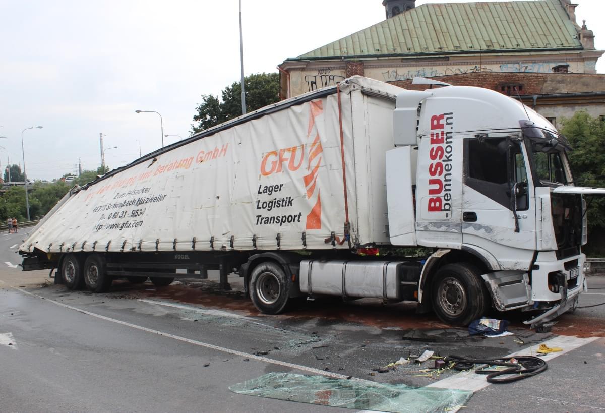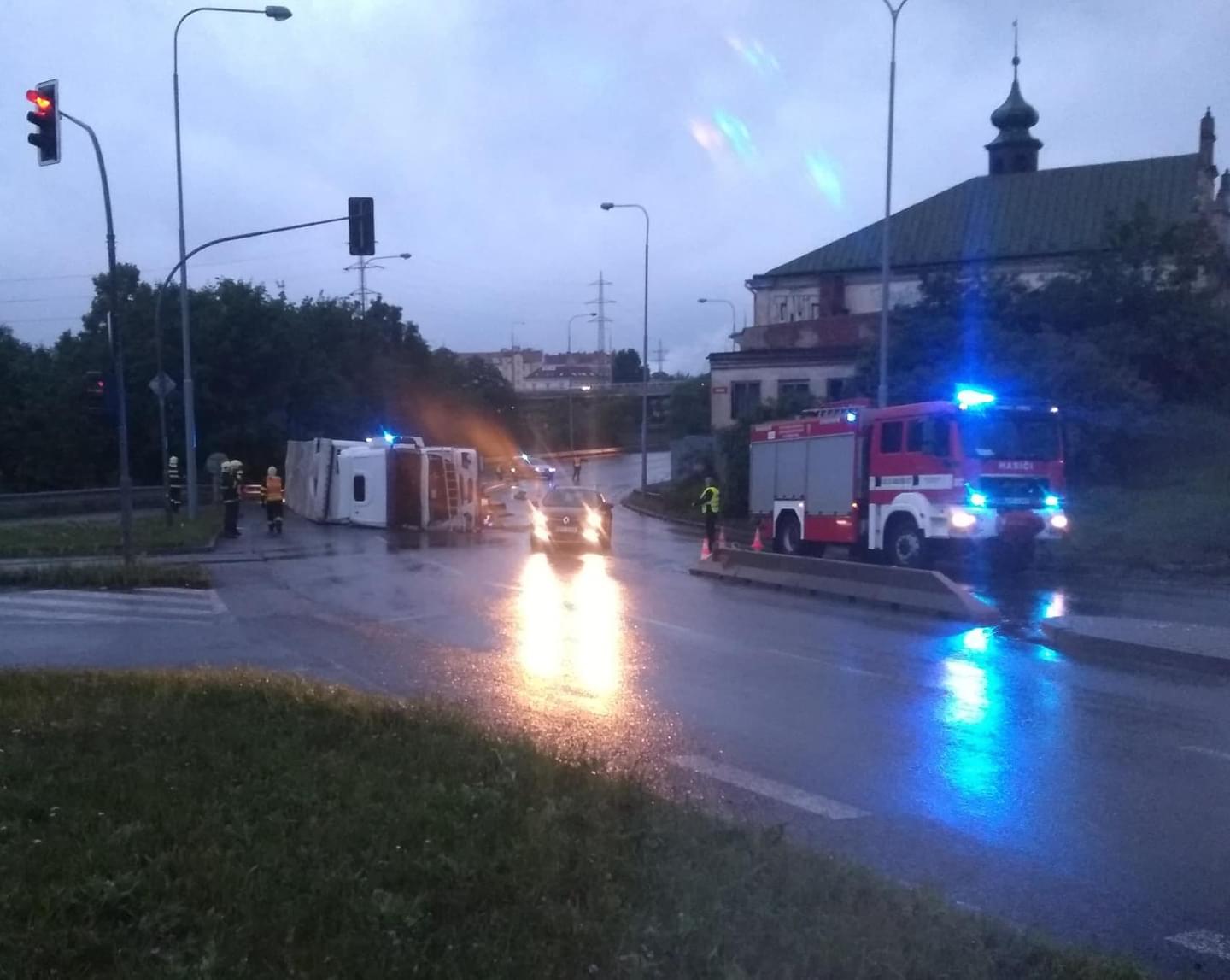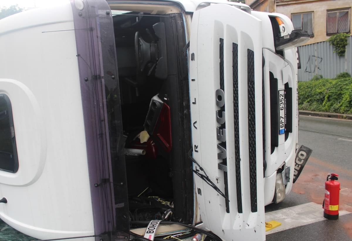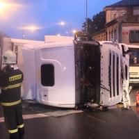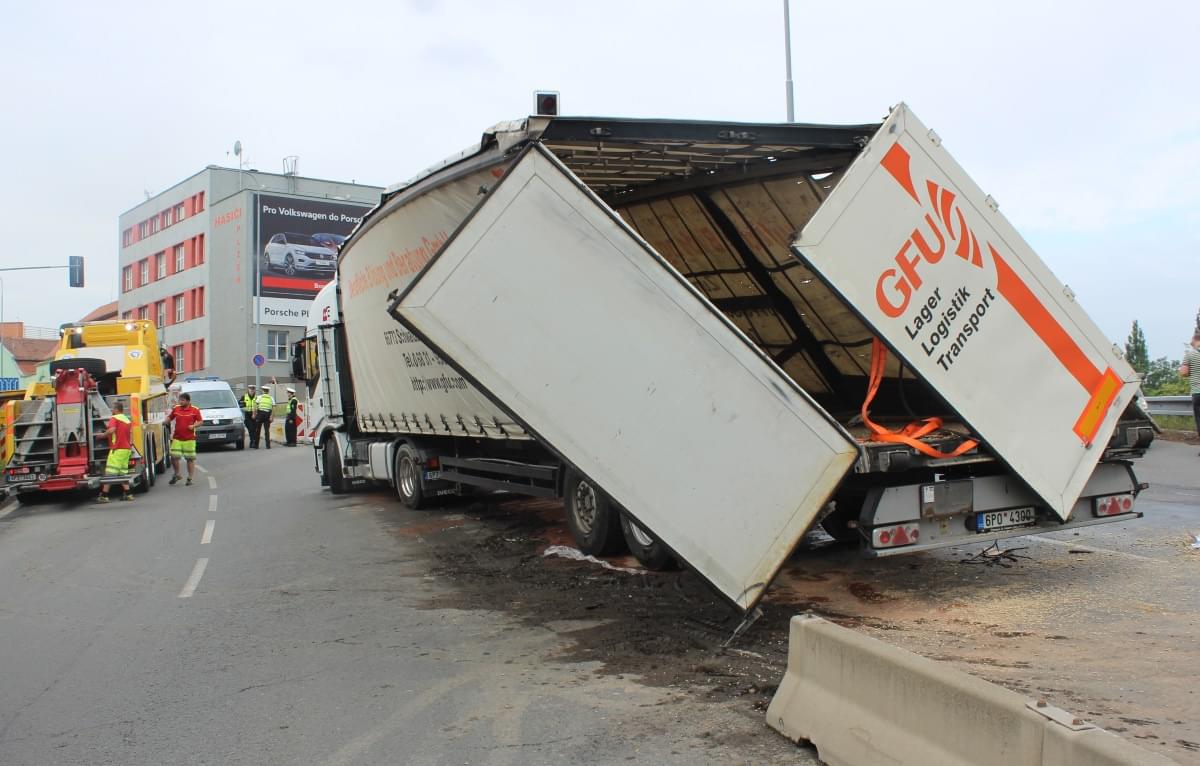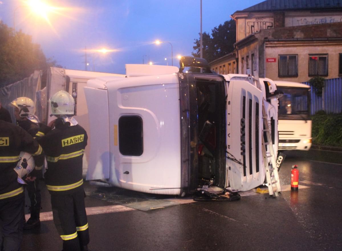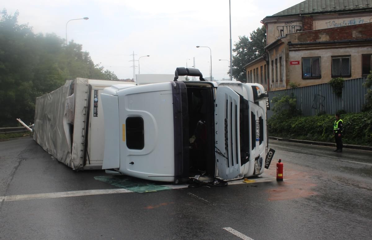 "Třicetičtyřletý řidič jel se s plně naloženou nákladní soupravou po Jízdecké ulici ve směru od ulice Tyršova ke křižovatce ulic Jízdecká, Palackého náměstí, Přemyslova. S největší pravděpodobností vlivem únavy s nákladní soupravou při přejíždění z pravého jízdního pruhu do levého a v levotočivé zatáčce narazil levou částí vozidla do betonových city bloků, přičemž došlo k převrácení nákladního vozu na pravou stranu na vozovku," uvedla k případu mluvčí policie.