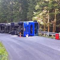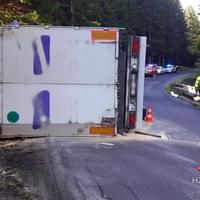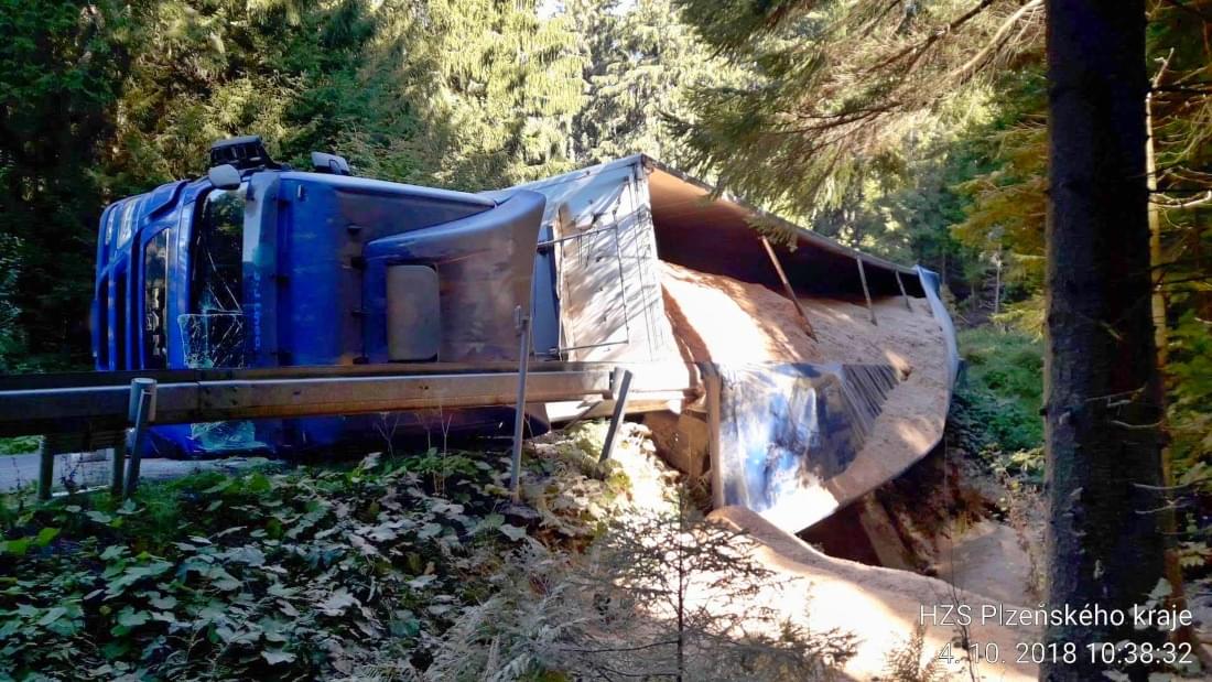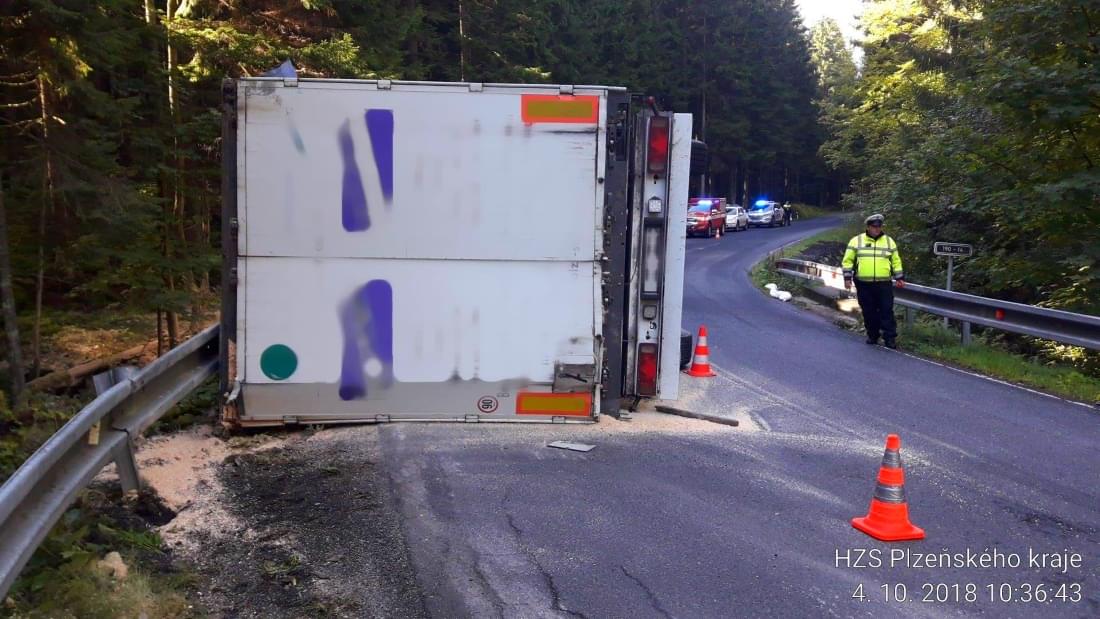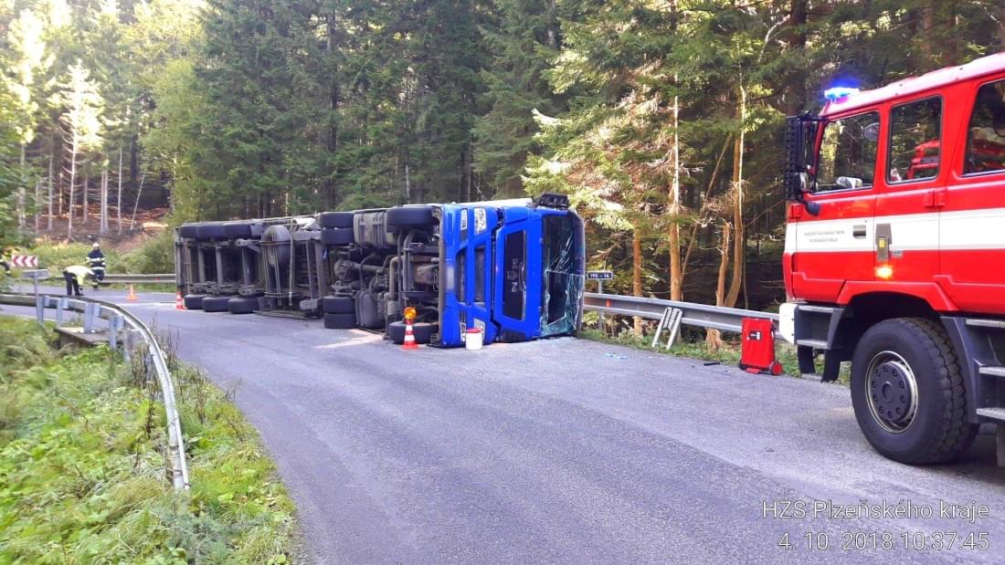 Všechny záchranné složky vyrážely dnes kolem desáté hodiny dopoledne na silnici 190 mezi Hojsovou Stráží a Špičákem, kde se převrátil nákladní automobil, převážející piliny.
