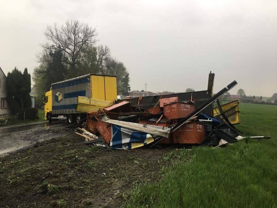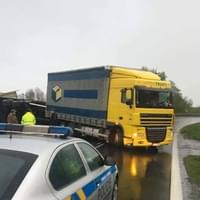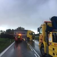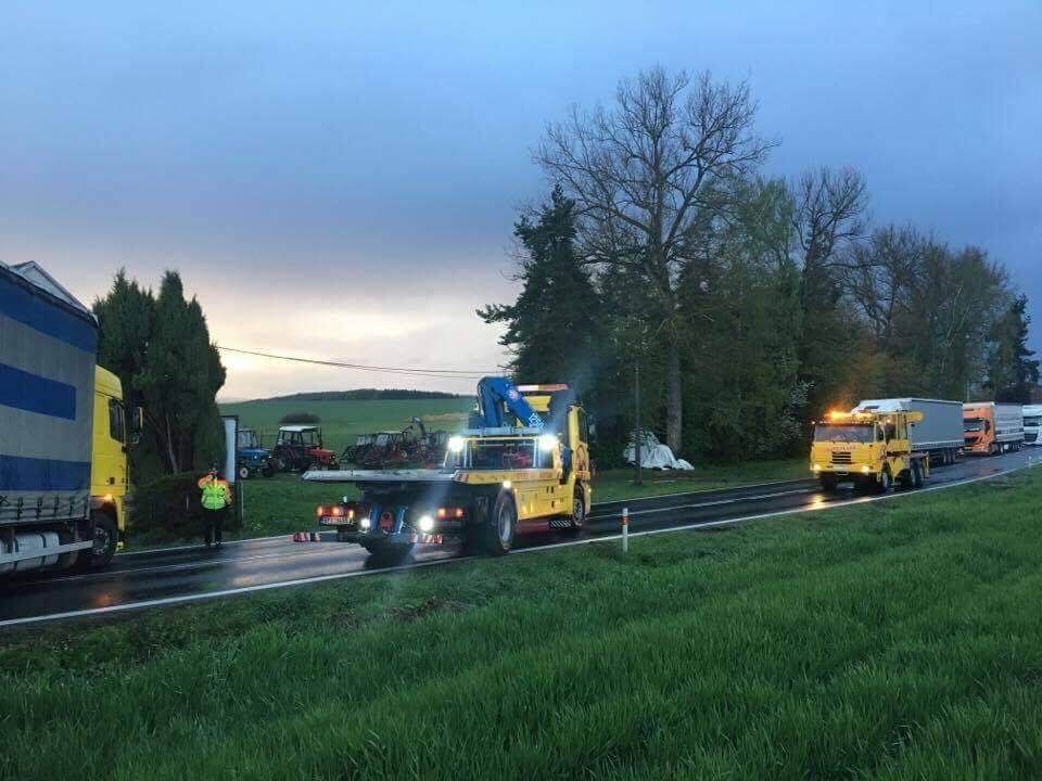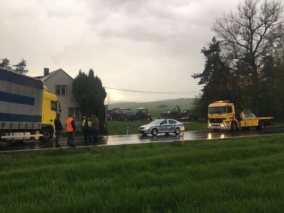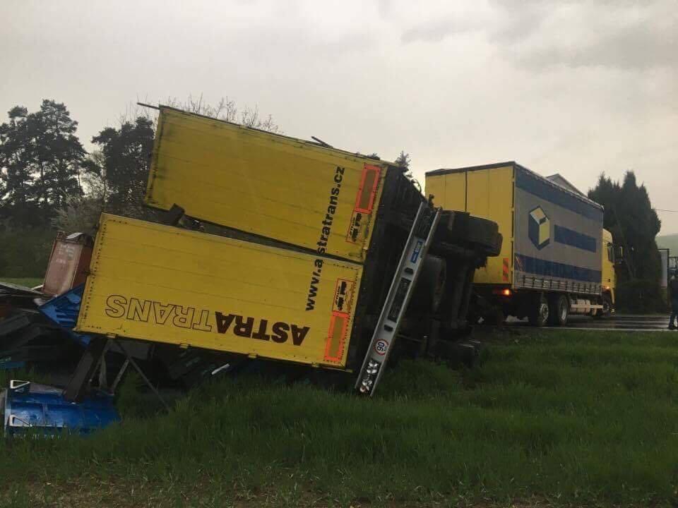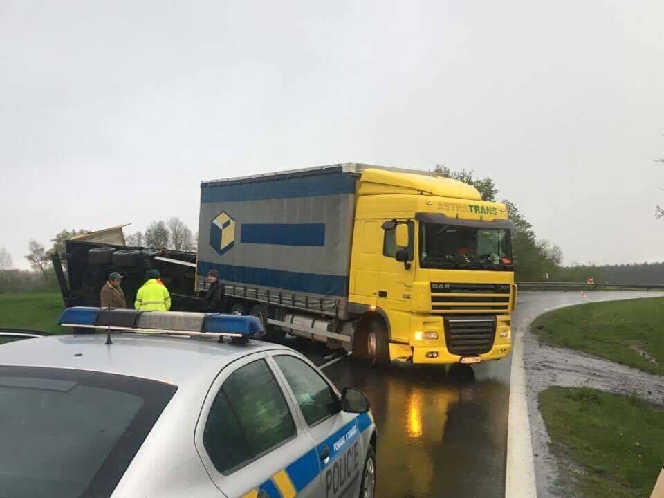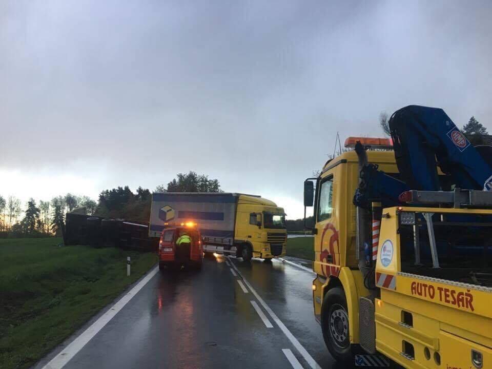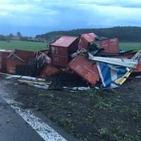 Dnes po půl osmé hodině večer došlo na silnici 26 mezi Meclovem a Březí k havárii nákladního automobilu, jehož přívěs se převrátil a z něj se rozsypaly naložené ocelové kontejnery. Havarovaná souprava zablokovala celou šíři vozovky.