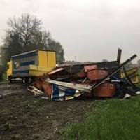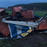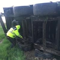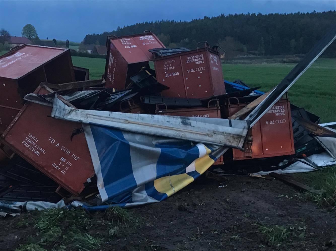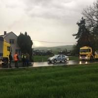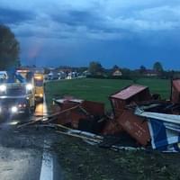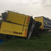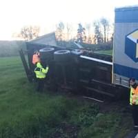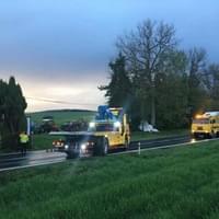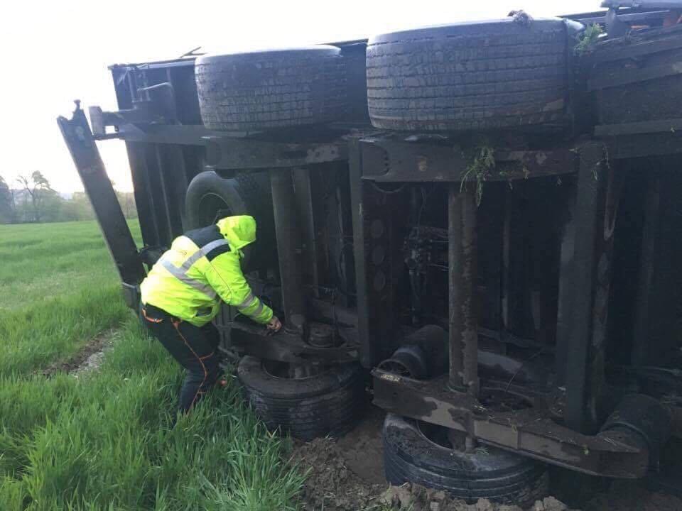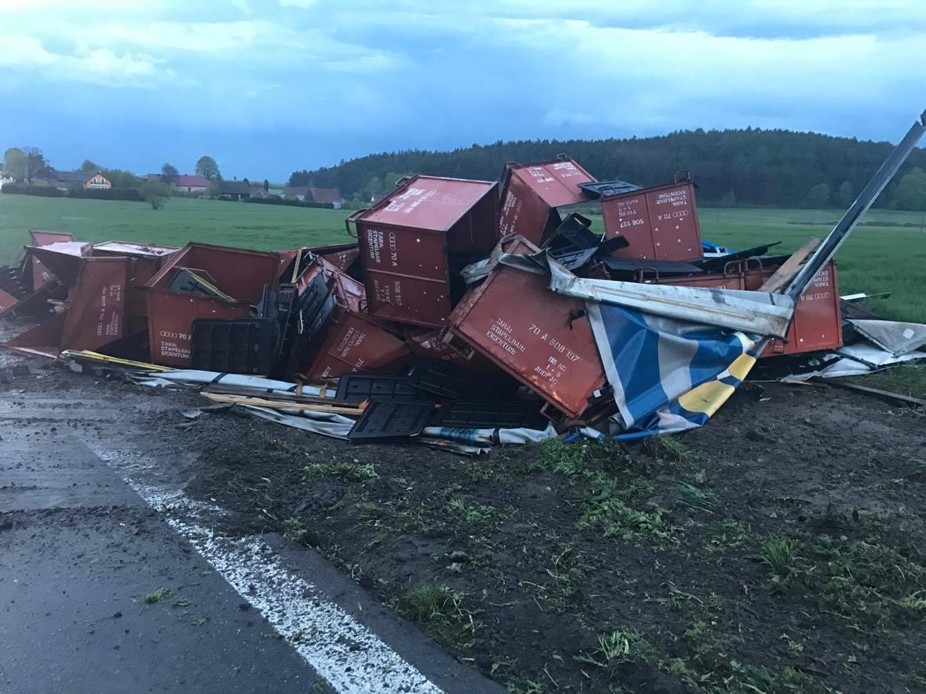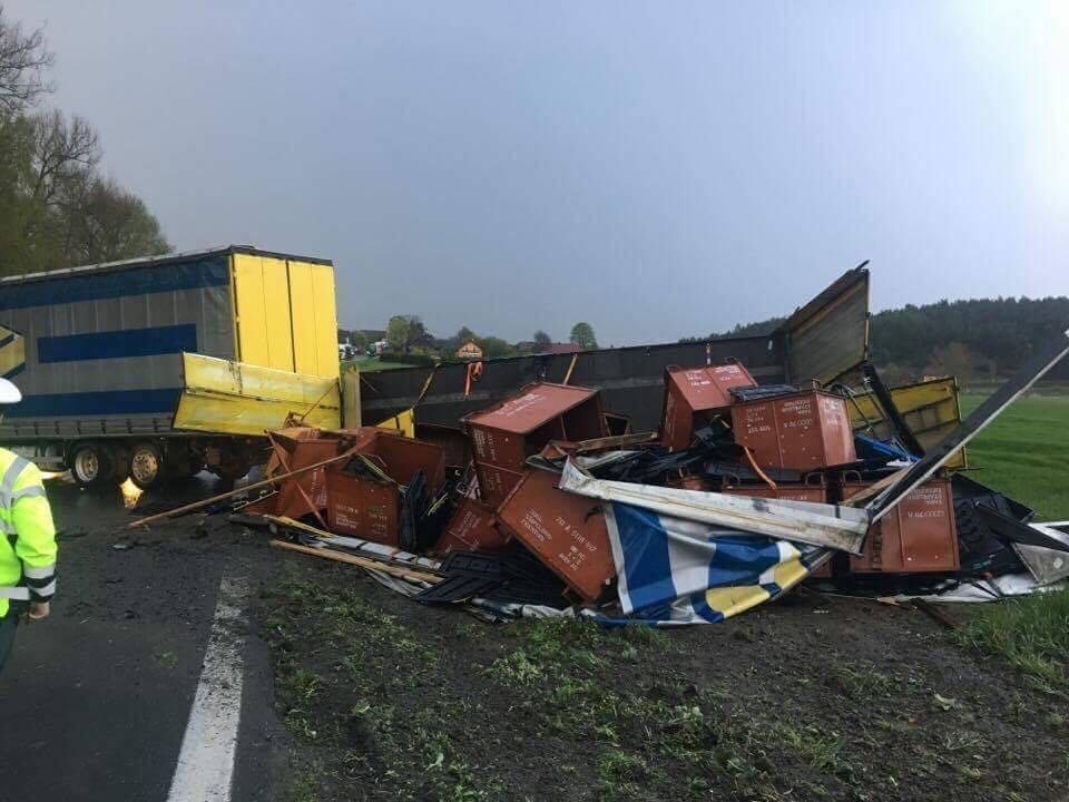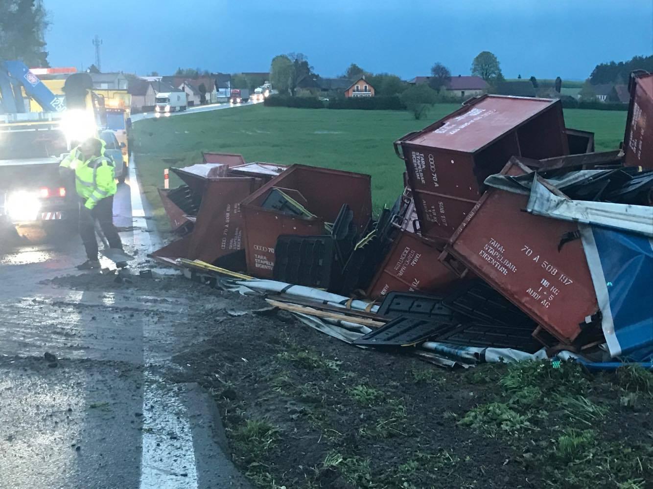 Dnes po půl osmé hodině večer došlo na silnici 26 mezi Meclovem a Březí k havárii nákladního automobilu, jehož přívěs se převrátil a z něj se rozsypaly naložené ocelové kontejnery. Havarovaná souprava zablokovala celou šíři vozovky.