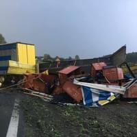 Na místě probíhá vyproštění přívěsu a překládání rozsypaného nákladu, dopravu policie řídí kyvadlově.