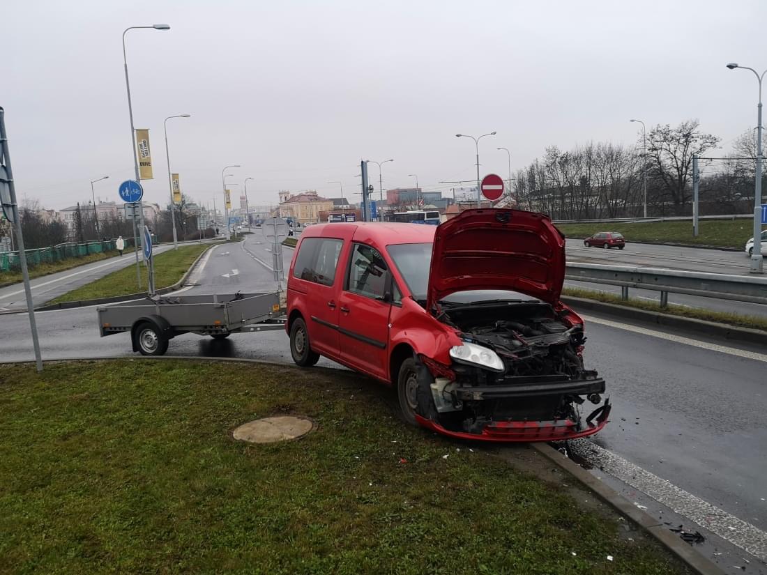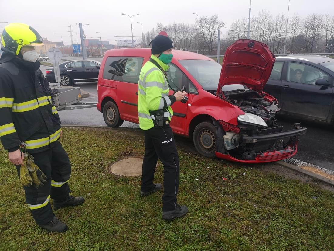 Dnes kolem jedné hodiny odpoledne došlo na výjezdu z parkoviště obchodního centra u Rondelu ke střetu osobního vozu Volkswagen Caddy s vlekem s autobusem linky 41 jedoucím z centra.