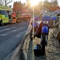 Ke střetu sice nedošlo ve velké rychlosti, ale motorkáři zůstala pod padajícím motocyklem noha a stroj mu ji těžce zranil v oblasti kotníku.