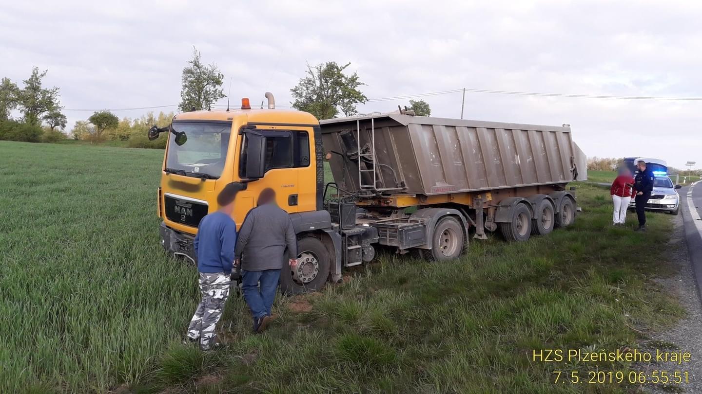 Dnes před sedmou hodinou ráno došlo na křižovatce mezi Kunějovicemi a Všeruby ke střetu osobního auta Škoda Fabia a nákladního vozu, vezoucího lomový kámen. Po střetu skončily oba vozy mimo silnici.