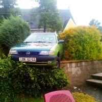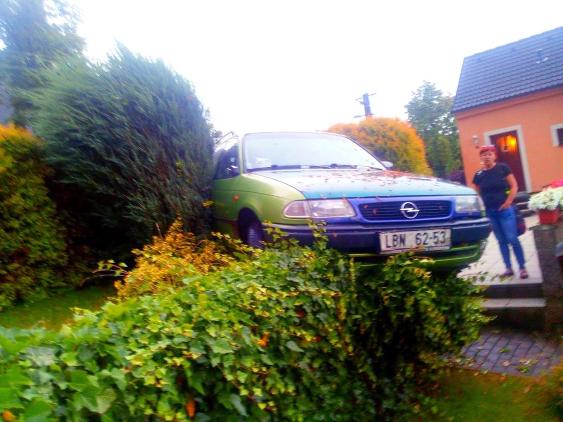 Opel dřevěným plotem projel na zahradu domu, kde ho ještě zbrzdil živý plot a vůz tak zůstal viset na zídce.