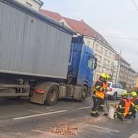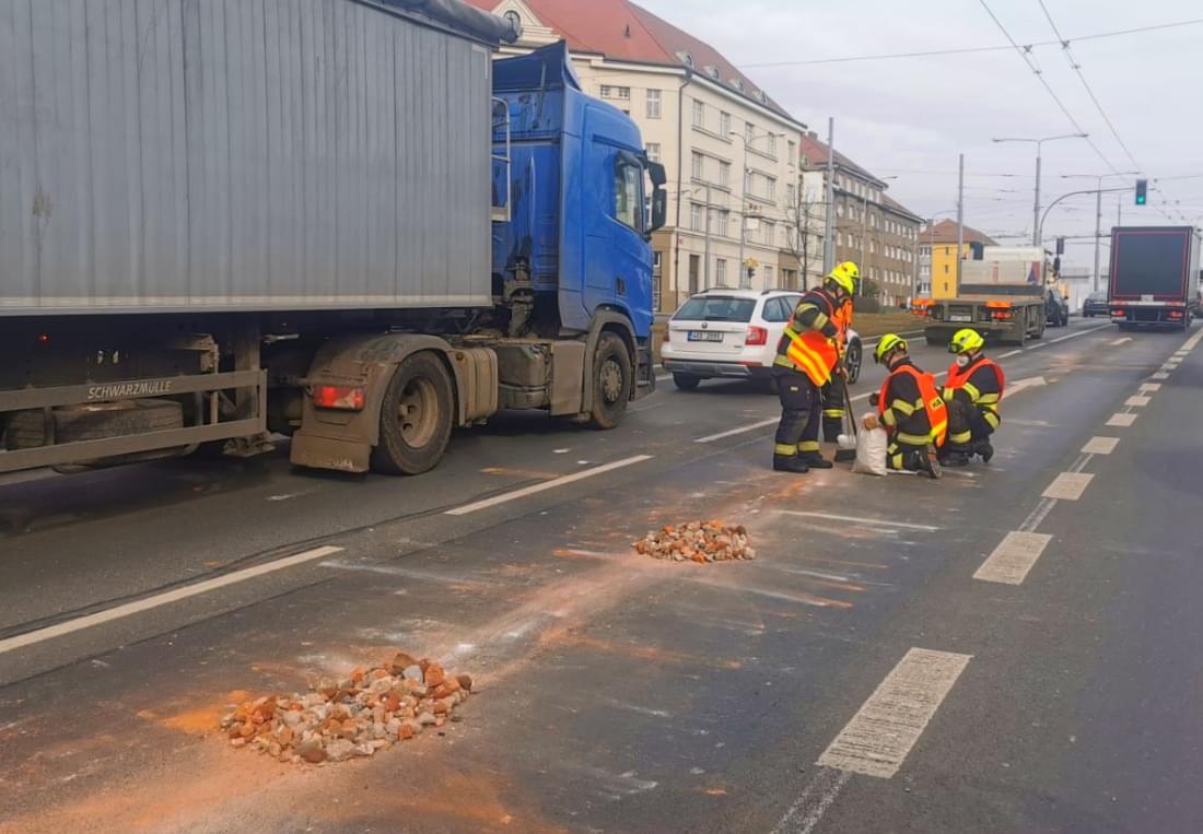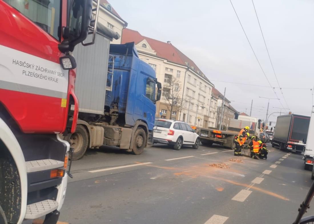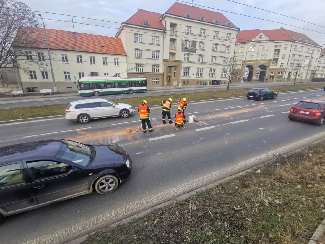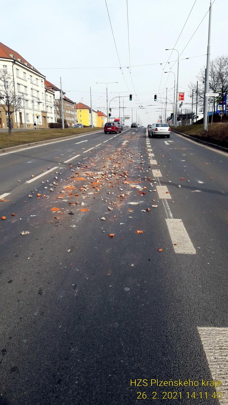Dnes kolem druhé hodiny odpoledne došlo v ulici U Prazdroje v Plzni ve směru na Doubravku, asi deset metrů před světelnou křižovatkou u čerpací stanice OMW, k rozsypání stavební suti z projíždějícího vozu.