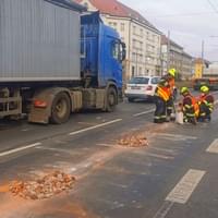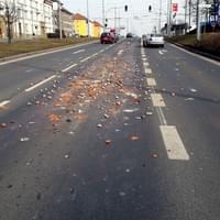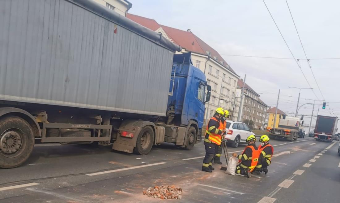 Kusy cihel jsou rozházené minimálně přes dva jízdní pruhy a hrozí poškození vozidel. Na místo ke zprůjezdnění silnice vyjeli hasiči, ale tvoří se zde dlouhé kolony.